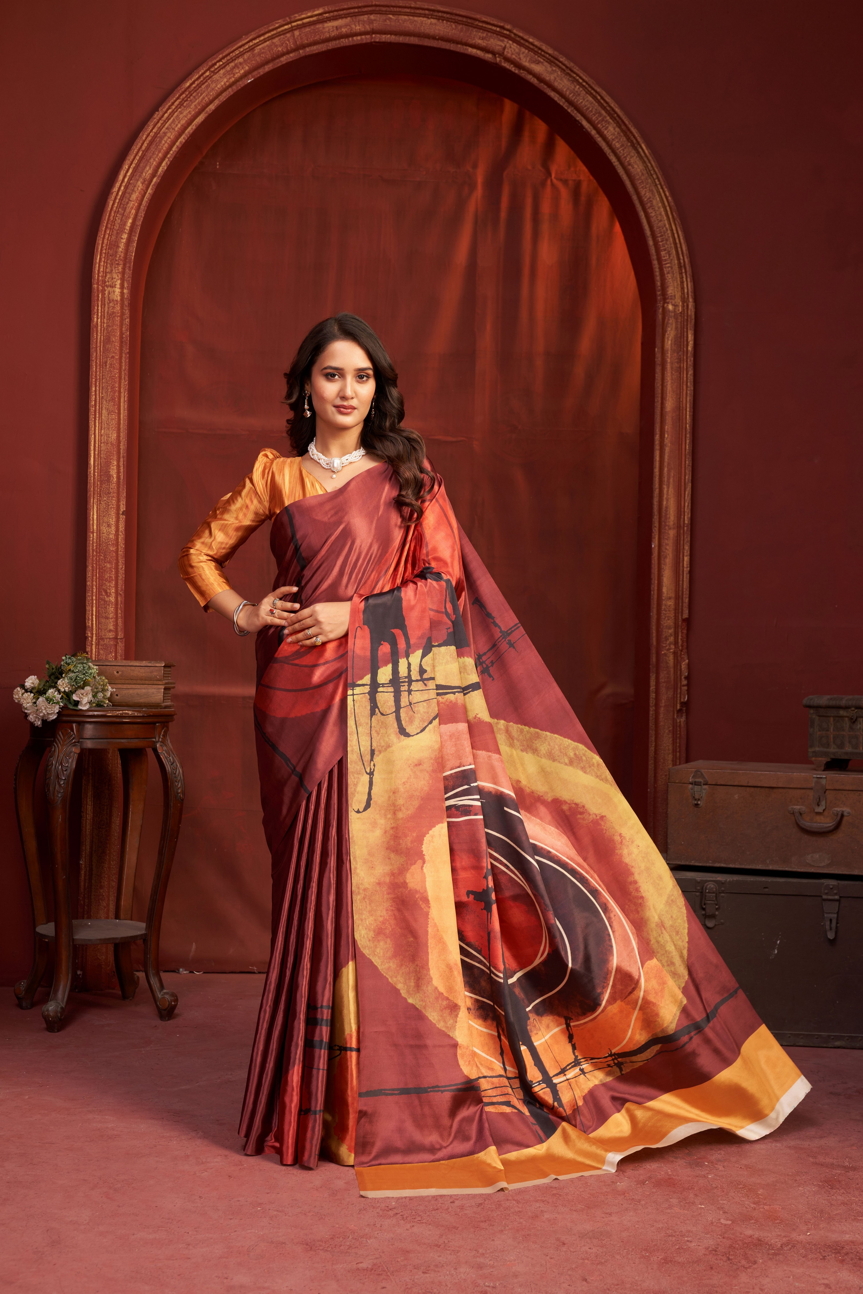 Orange Color Malai Crepe Silk Fabric Designer Digital Printed Girlie Fashinova Saree