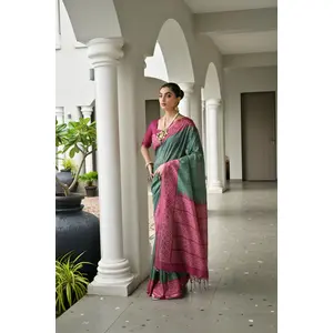 Green Color Tussar Silk Fabric Ikkat...