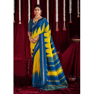 Yellow & Blue Color Ikkat Silk Fabric...