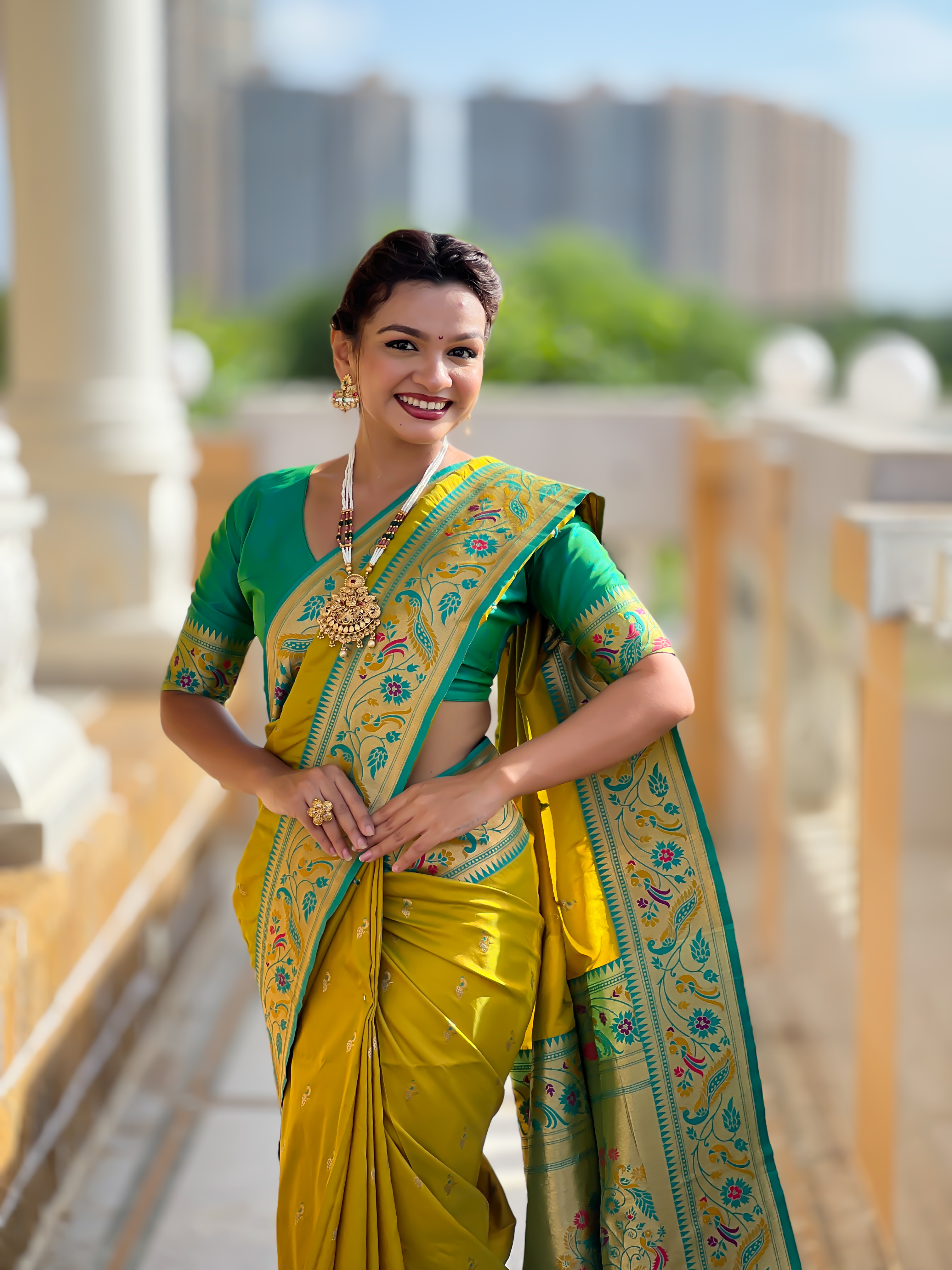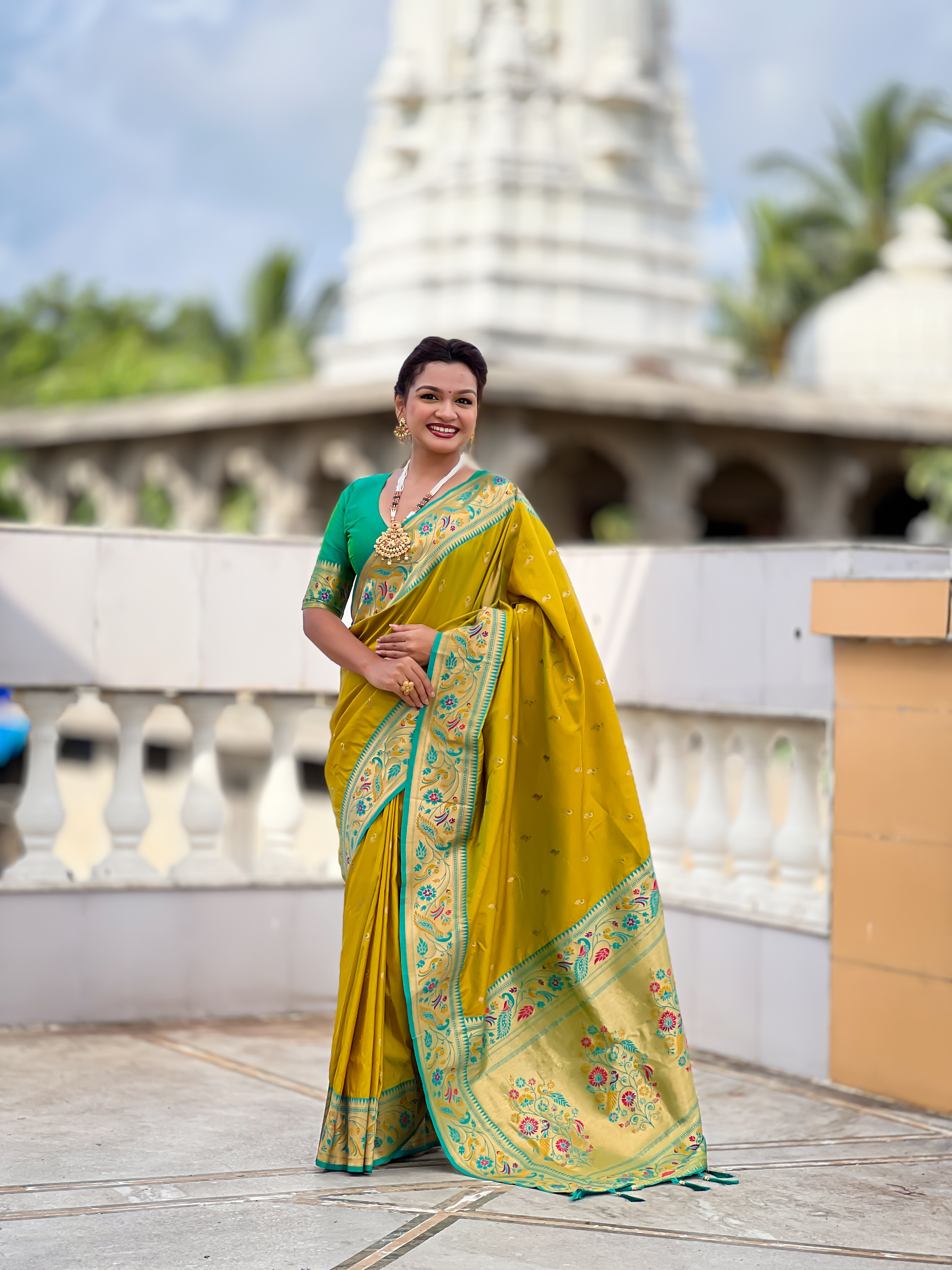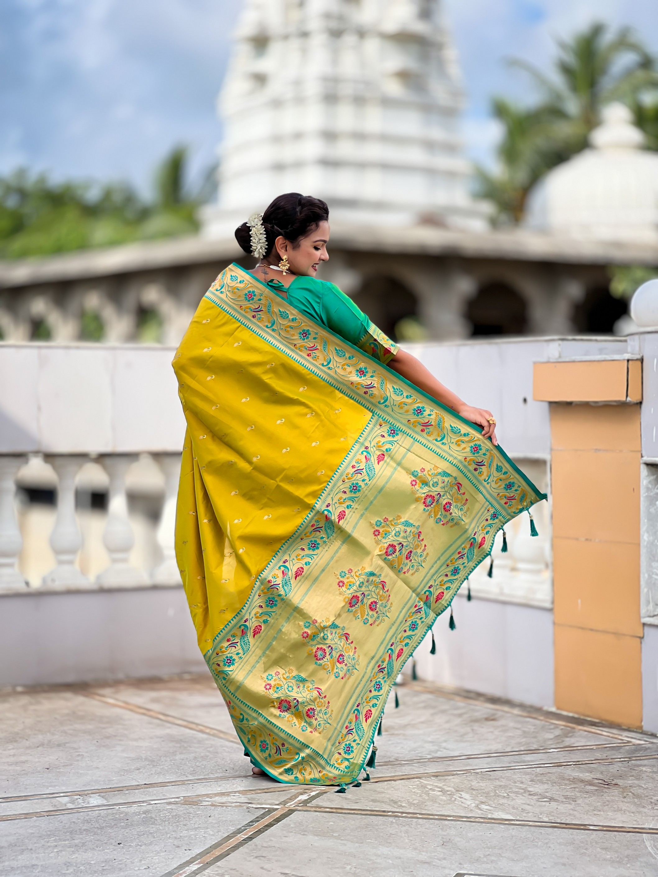 Parrot Green Color Paithani Silk Fabric Woven Meenakari Jacquard Designer Saree