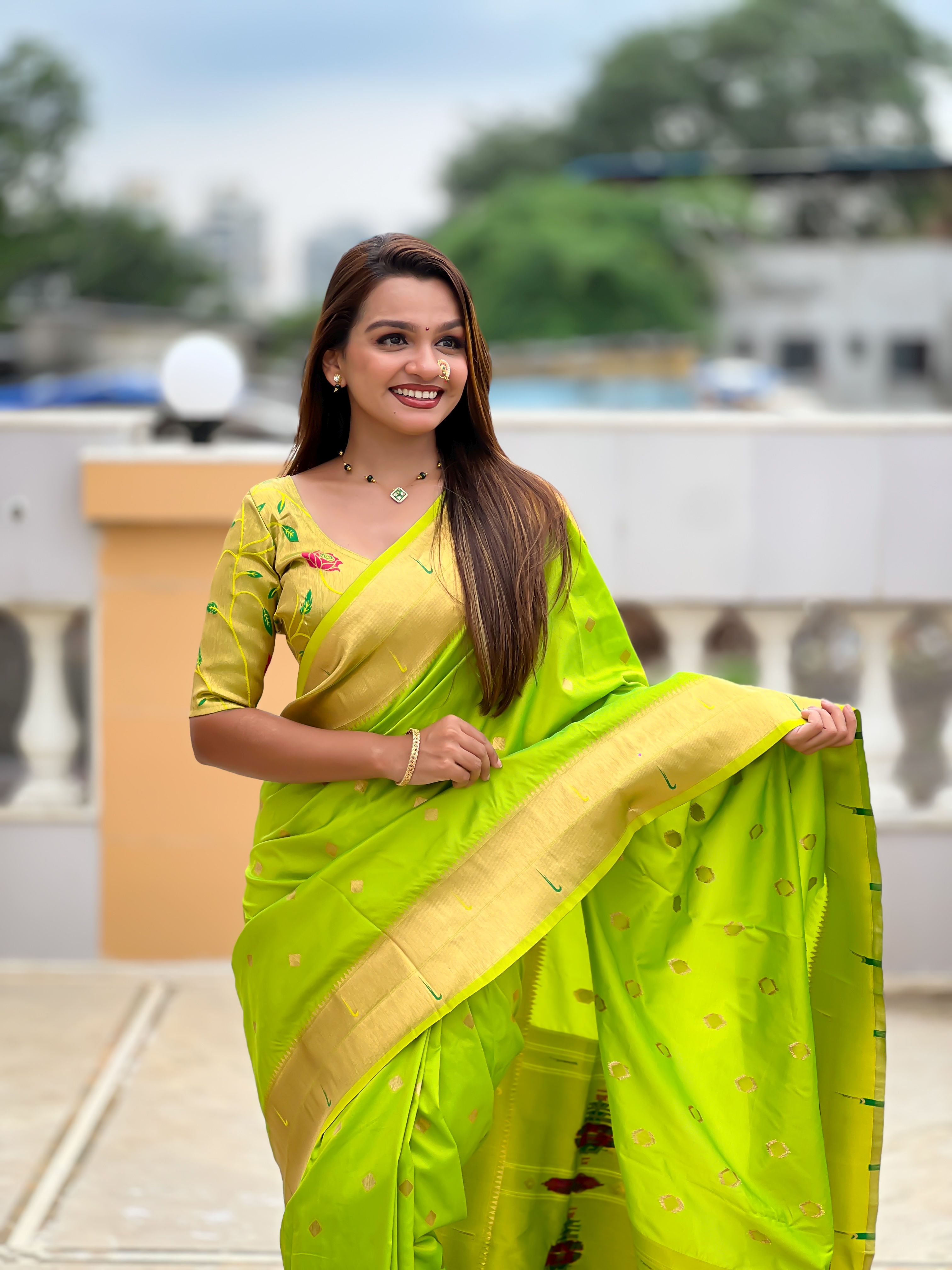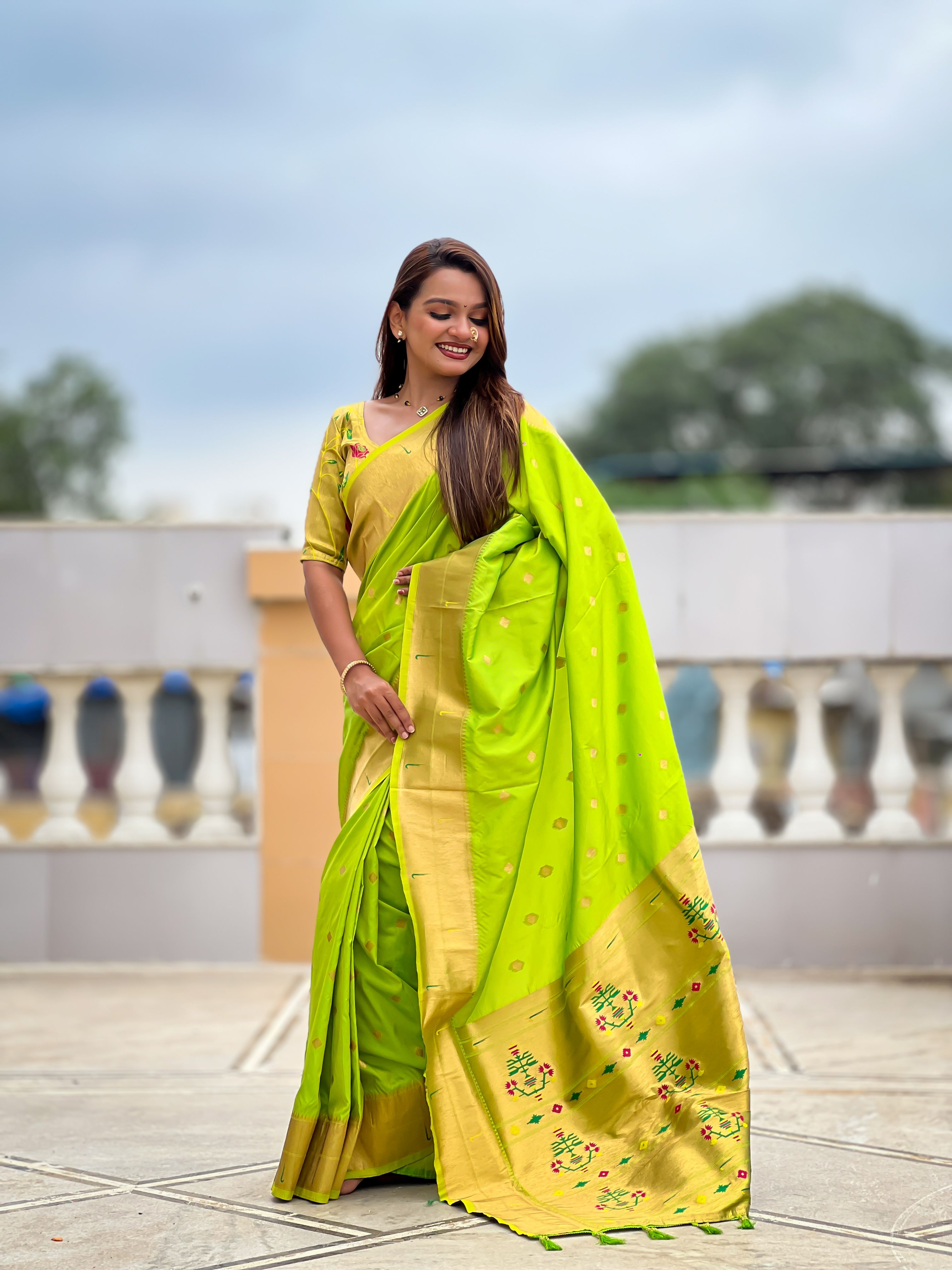 Parrot Green Color Paithani Silk Woven Jacquard Jari Designer Ethnic Saree