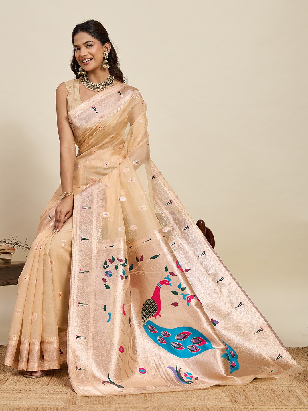 Garb This Party Wear Saree Paired With Blouse.This Saree And Blouse Are Cotton Silk Fabric With Woven Paithani Meenakari Designer. Buy This Pretty Saree Now.