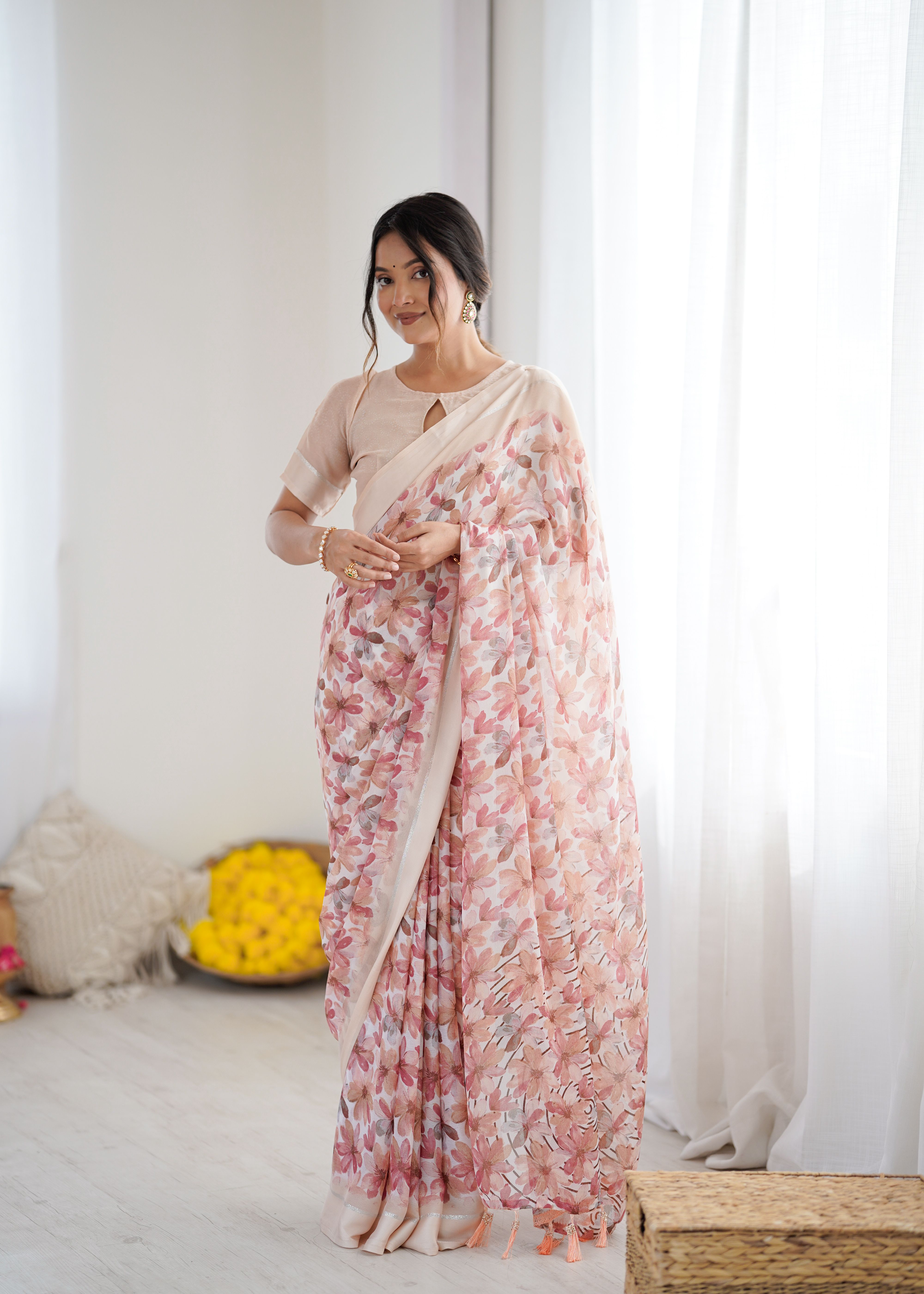Peach Color Moss Satin Patta Fabric Designer Printed Ethnic Partywear Saree