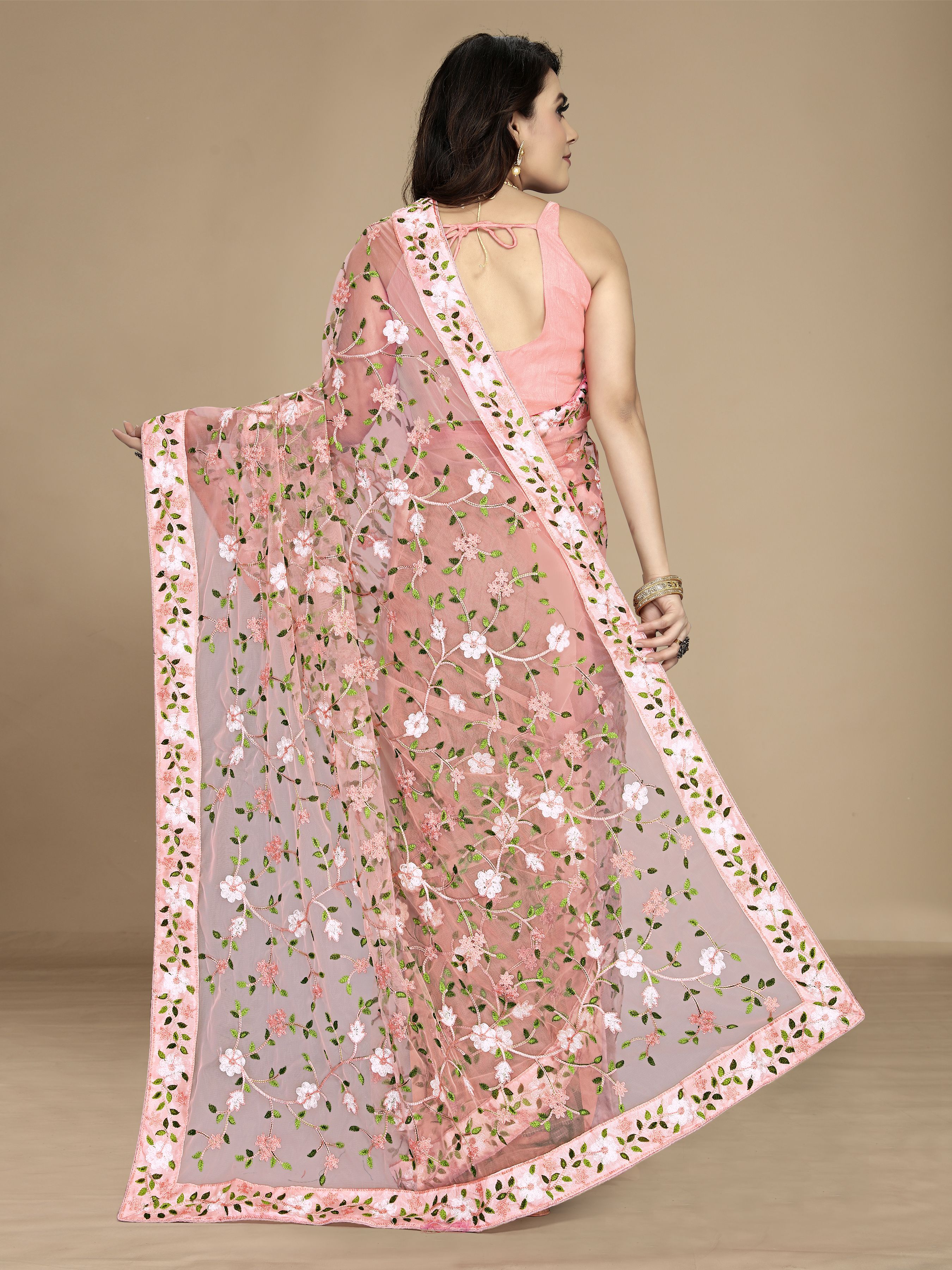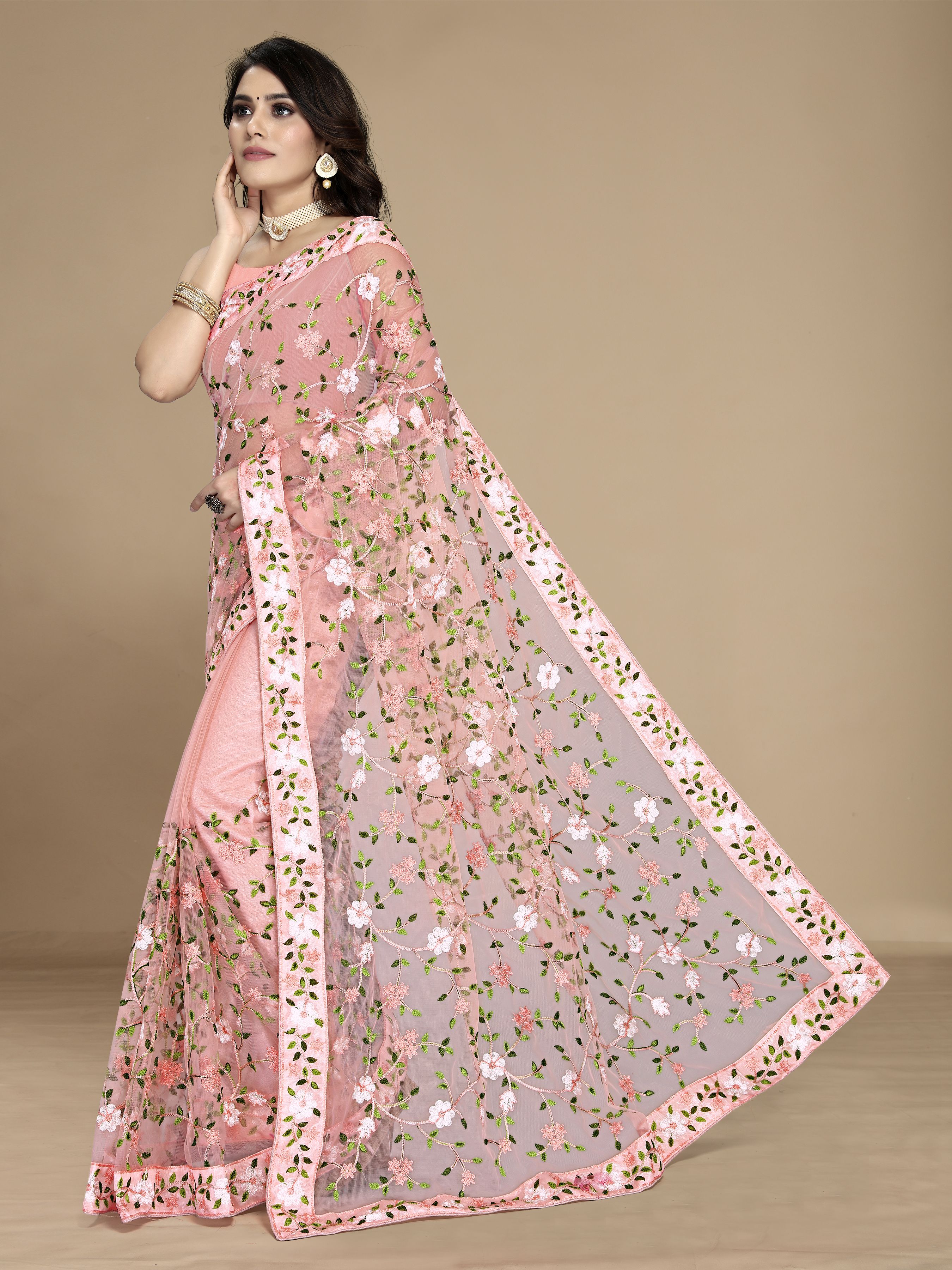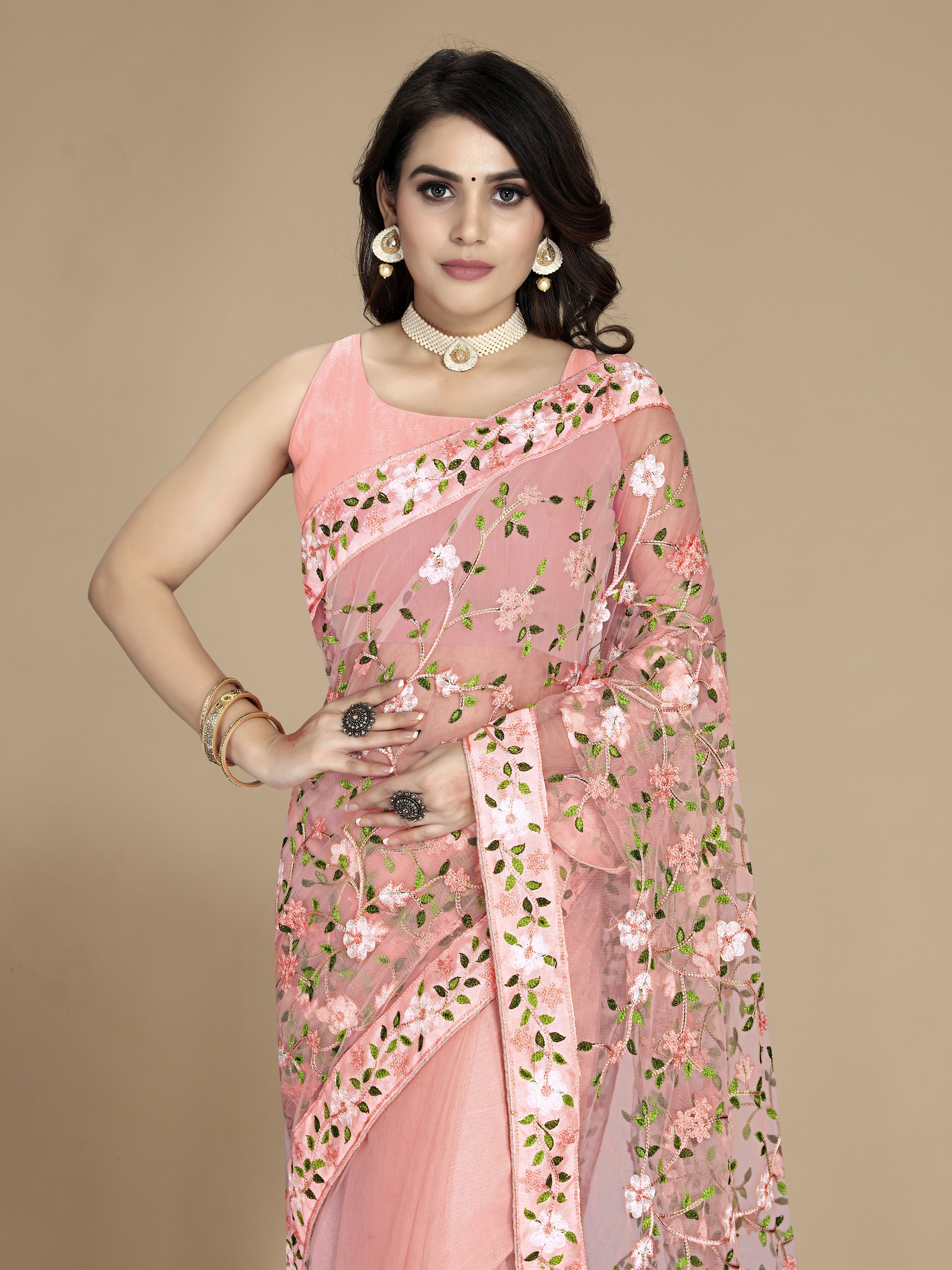Peach Color Soft Net Fabric Designer Multy Thread Embroidery Work Smart Partywear Saree