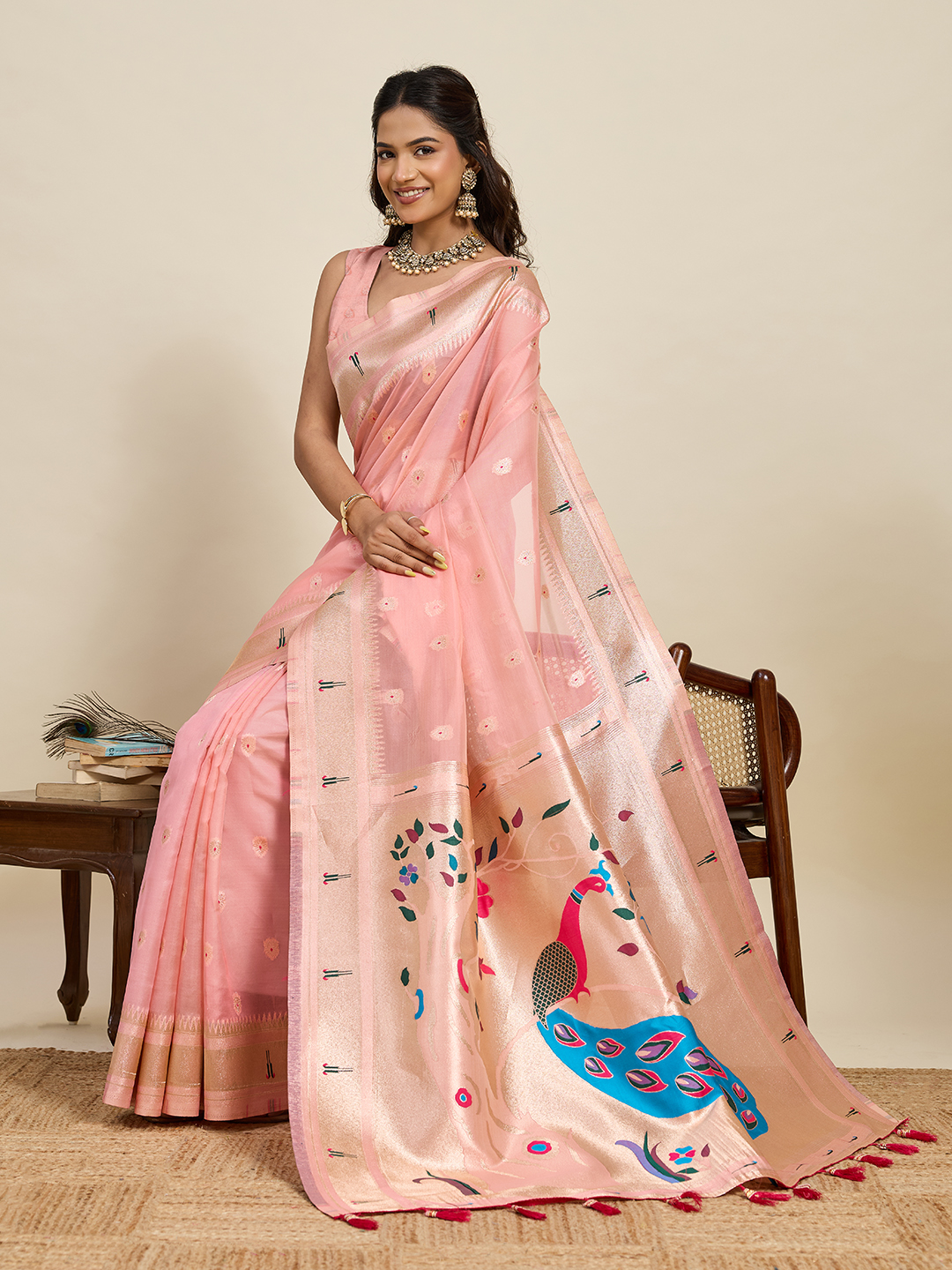 Garb This Party Wear Saree Paired With Blouse.This Saree And Blouse Are Cotton Silk Fabric With Woven Paithani Meenakari Designer. Buy This Pretty Saree Now.