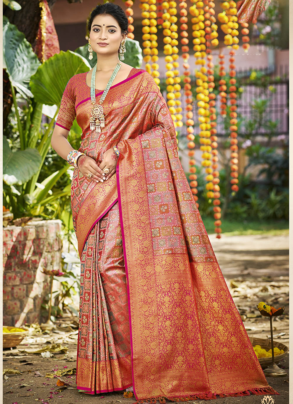 Pink Color Dharmavaram Fabric Heavy Woven Designer Wedding Wear Saree