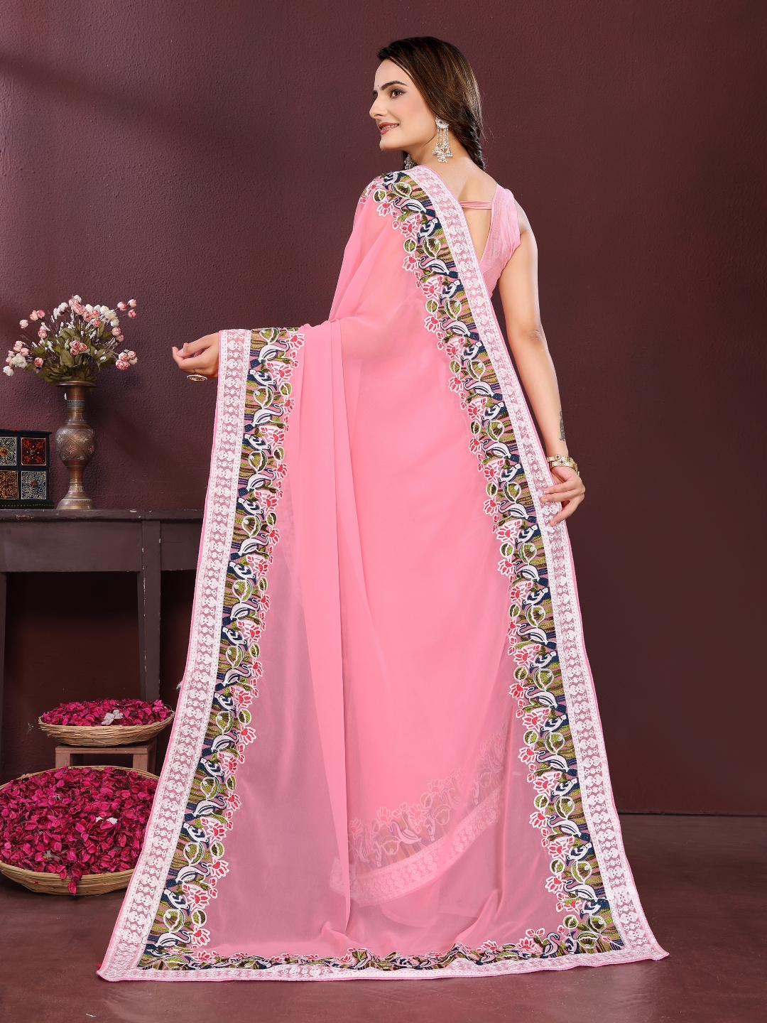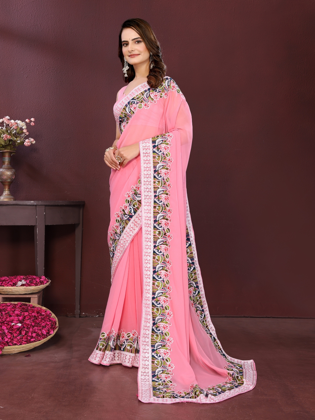 Pink Color Georgette Fabric Designer Embroidery Work Ethnic Partywear Saree