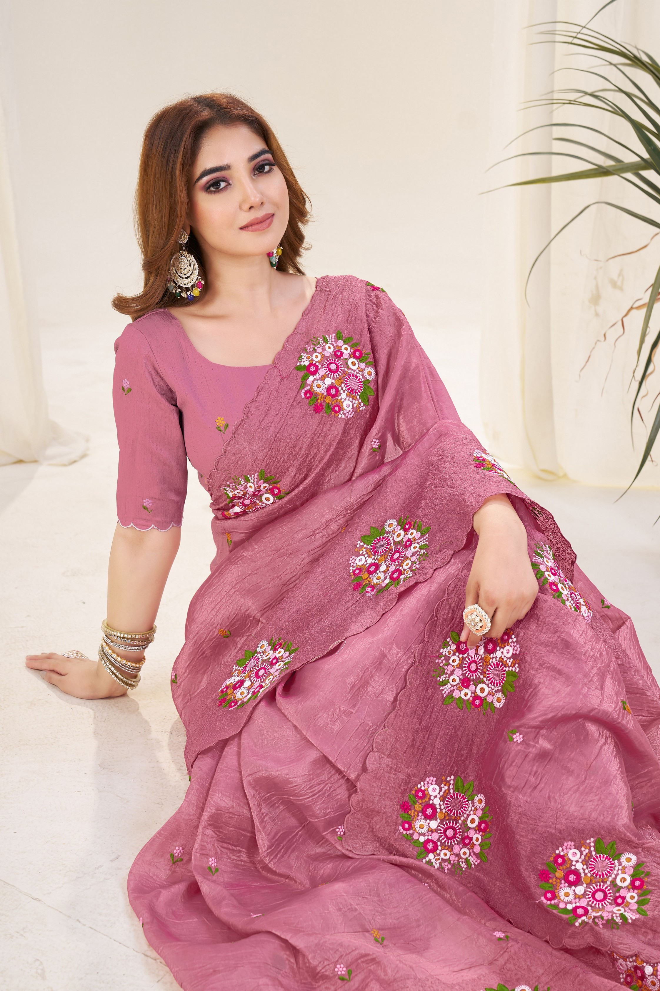 Pink Color Gold Crush Fabric Designer Embroidered Saree