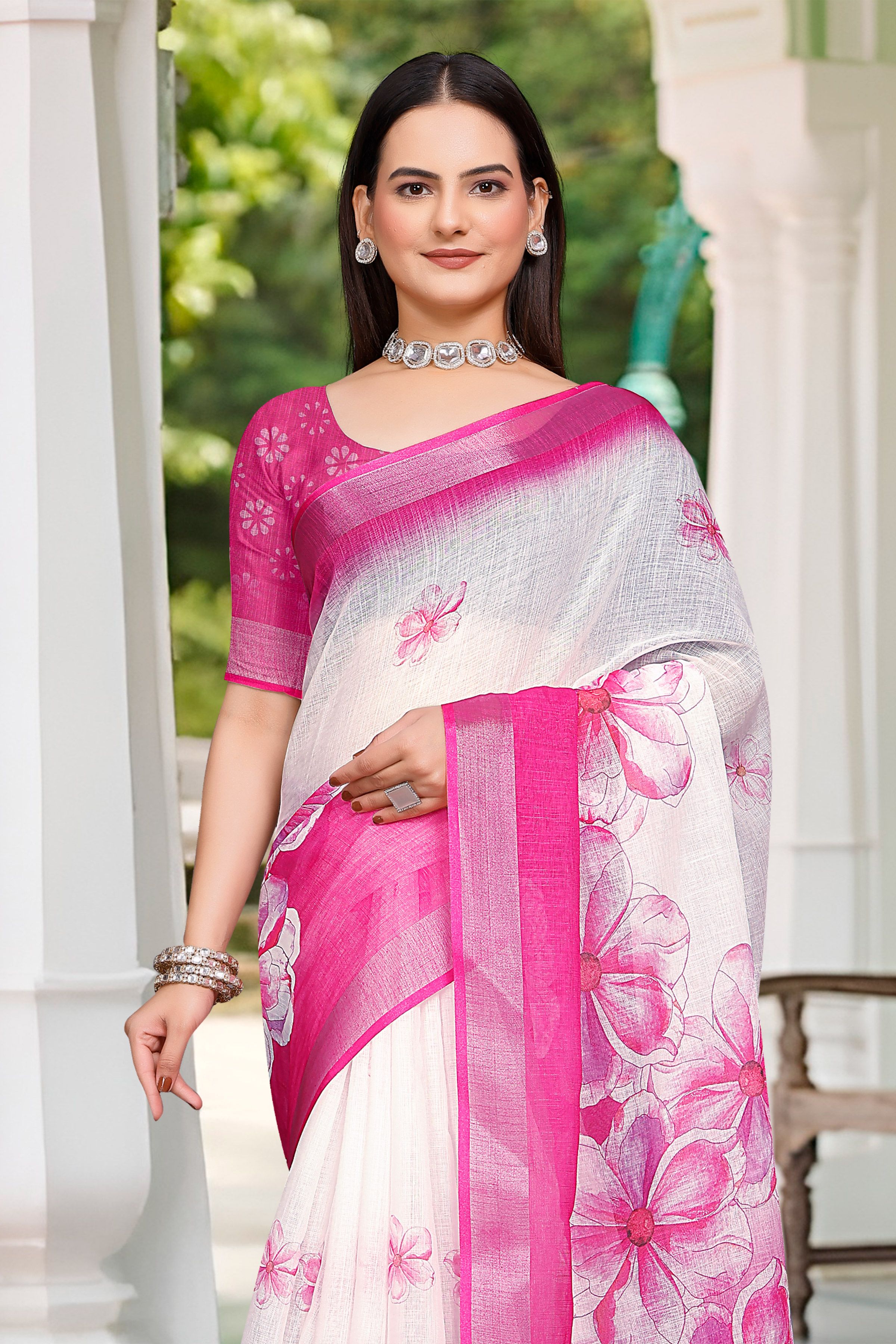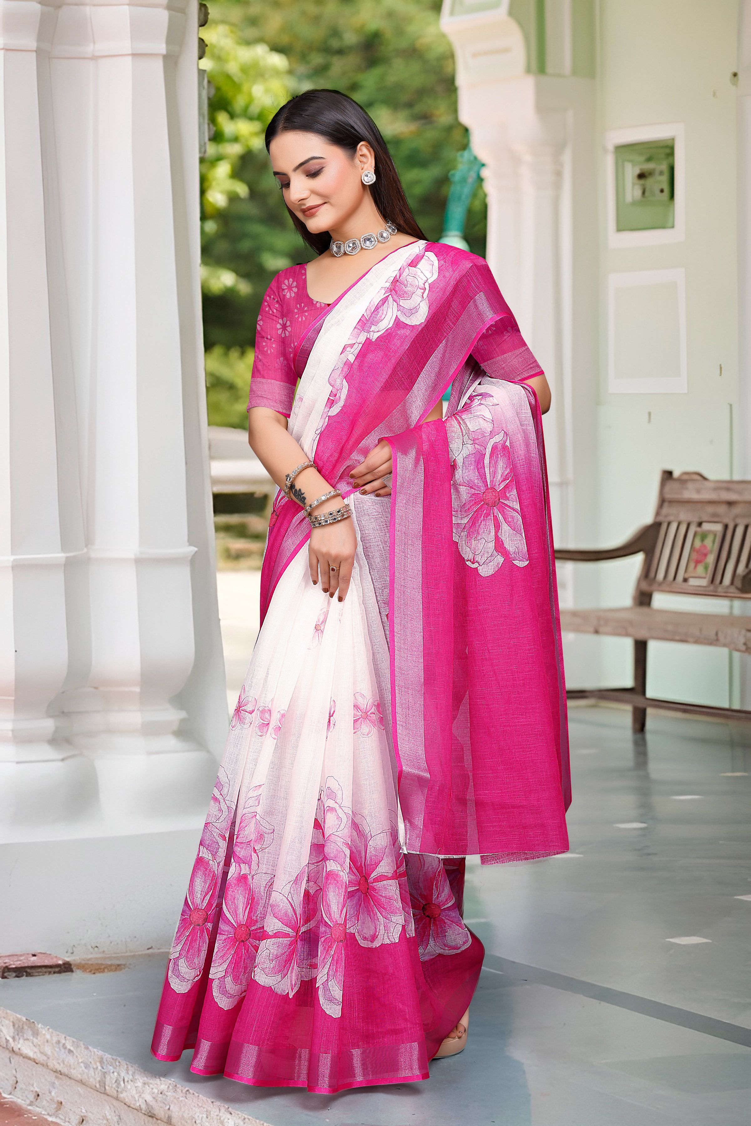 Pink Color Linen Cotton Fabric Woven Border Designer Printed Saree