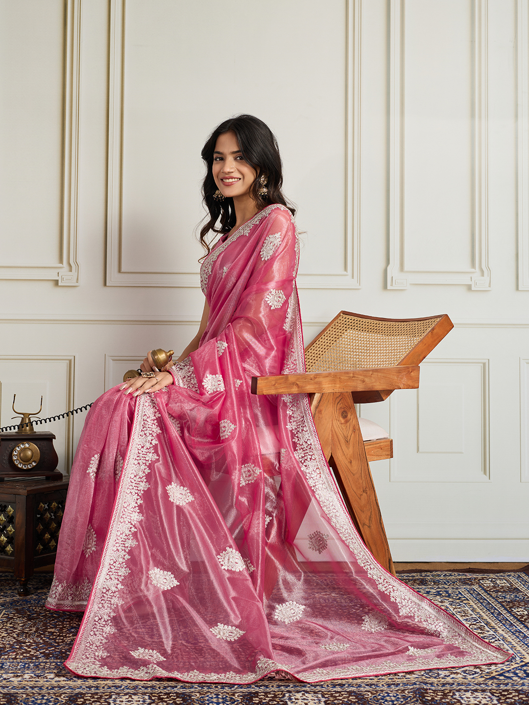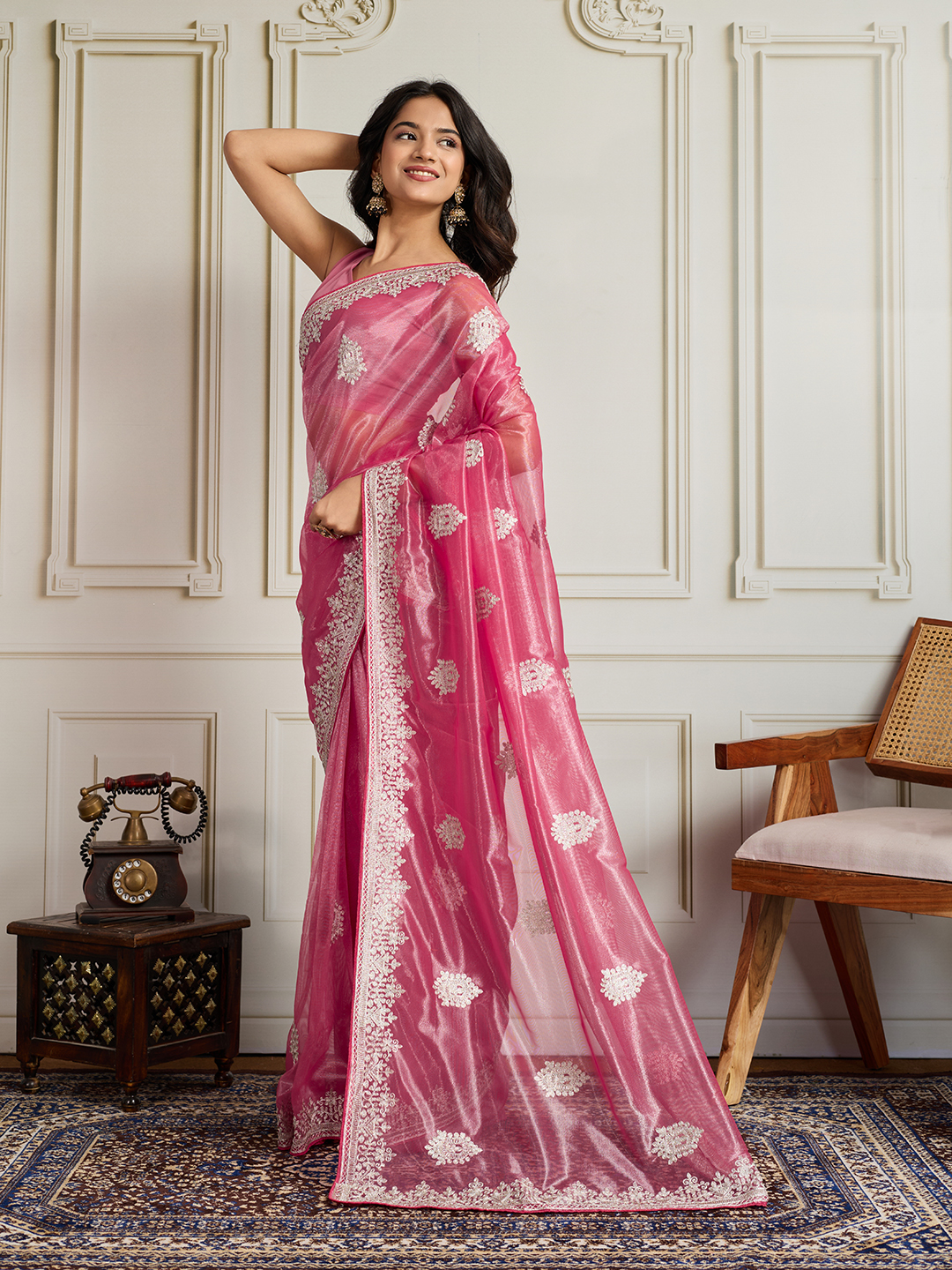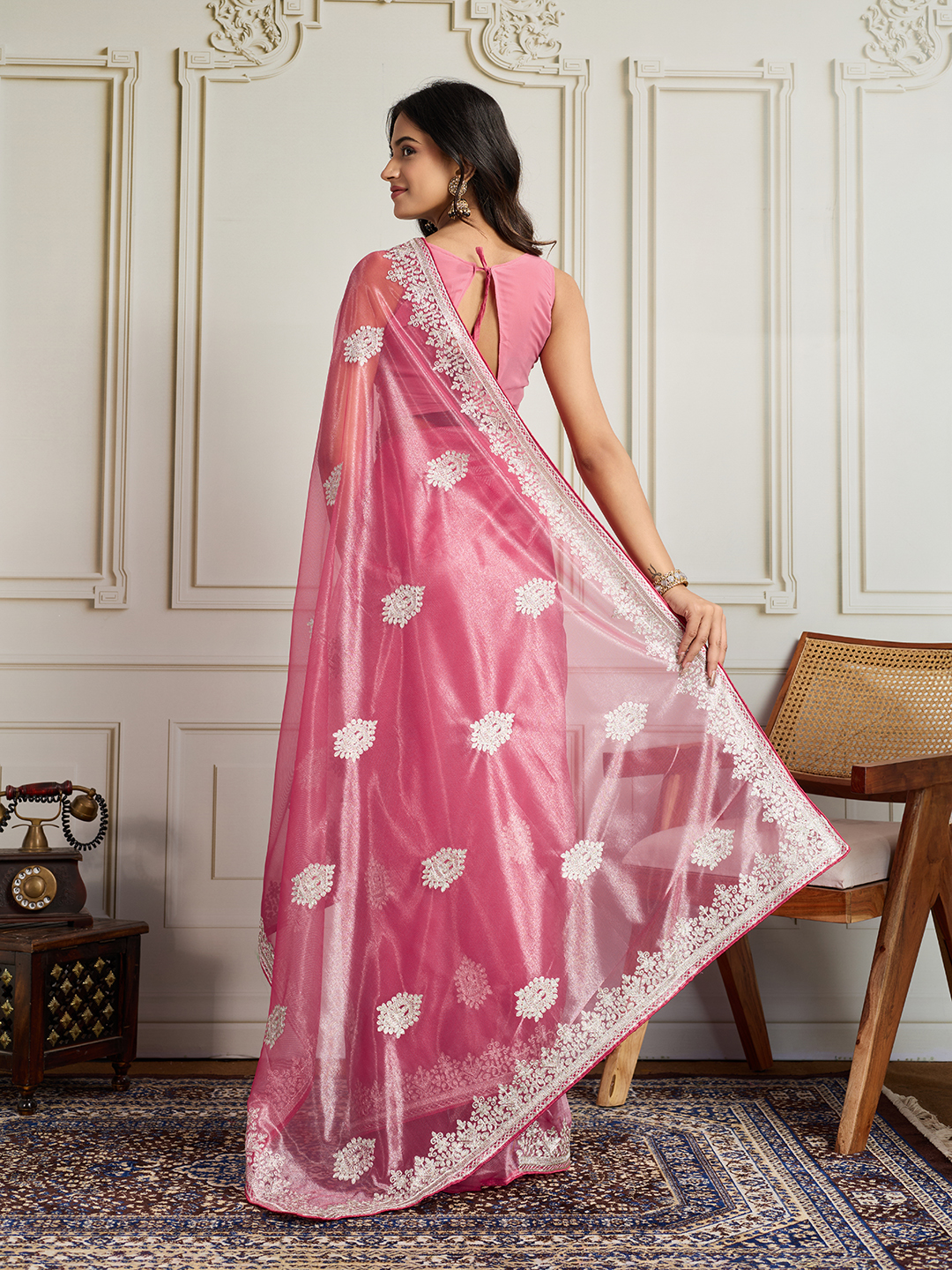 Pink Color Twill Net Fabric Designer Embroidery Work Ethnic Partywear Saree