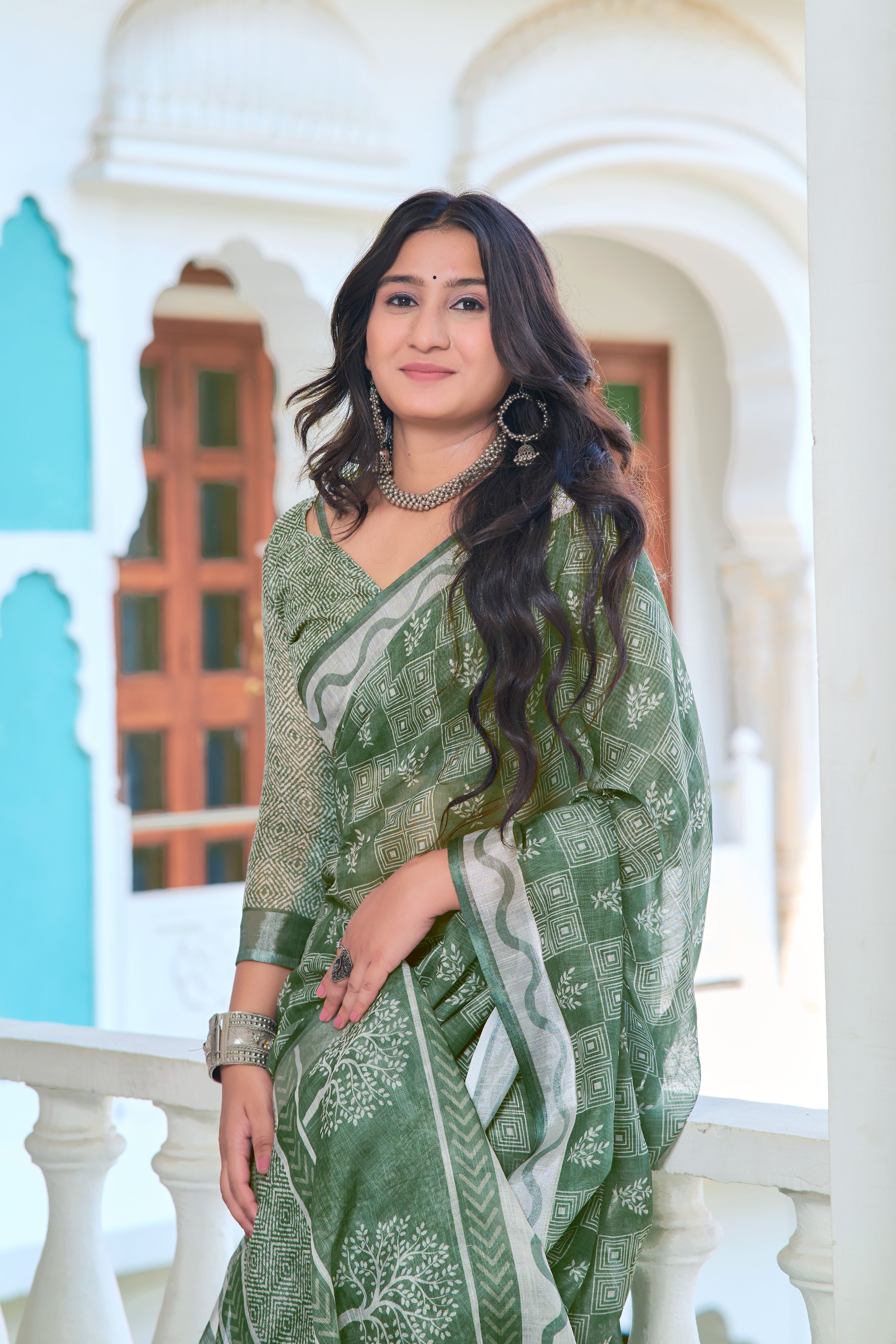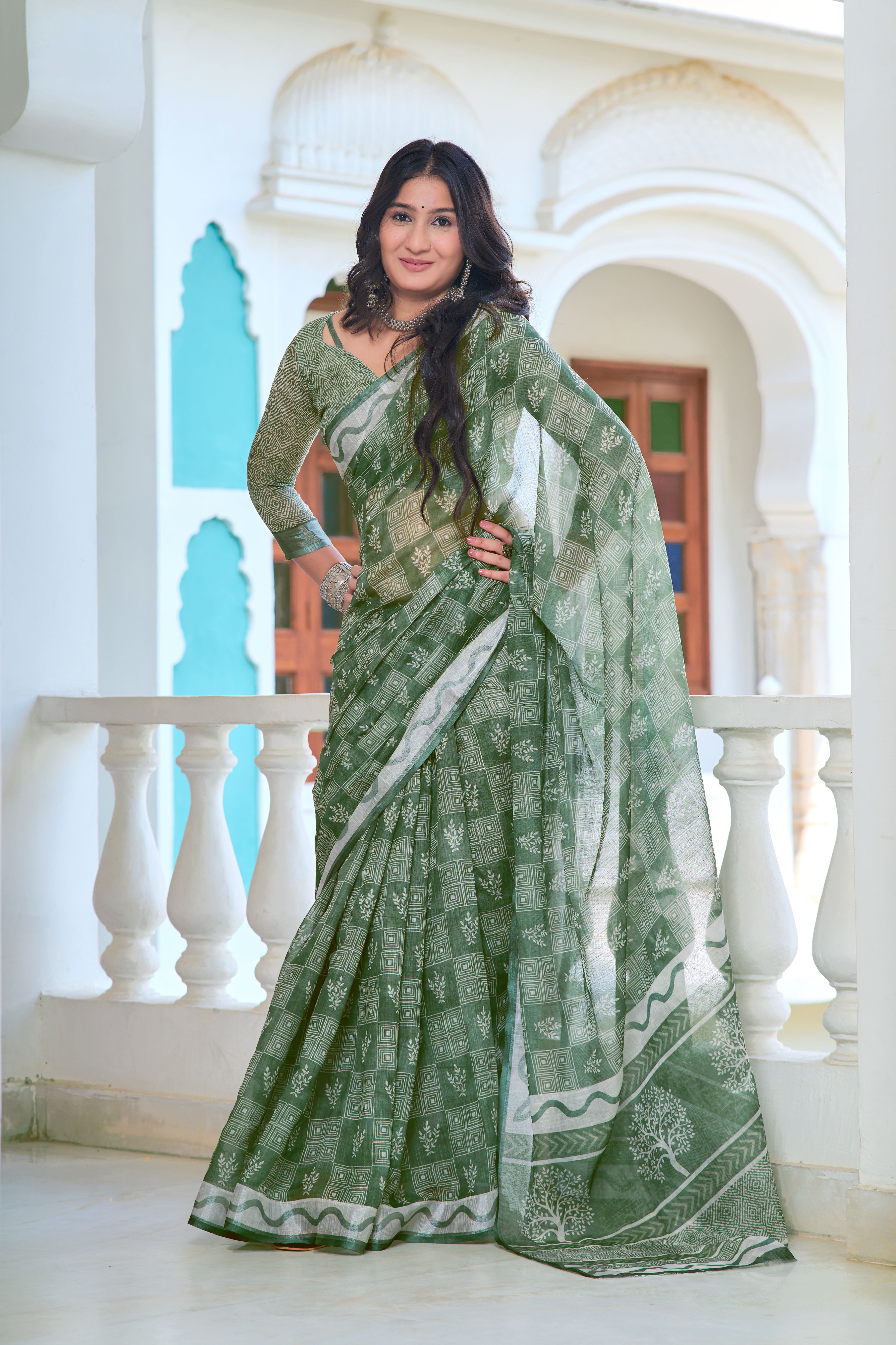 Pista Color Beautiful Linen Cotton Fabric Designer Festive Wear Saree