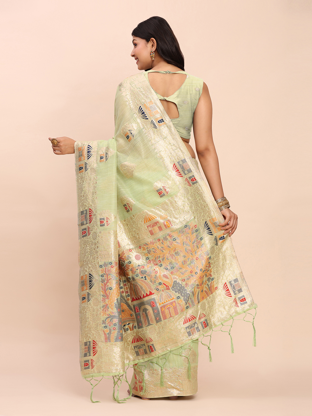 Pista Color Beautiful Linen Cotton Fabric Woven Designer Saree