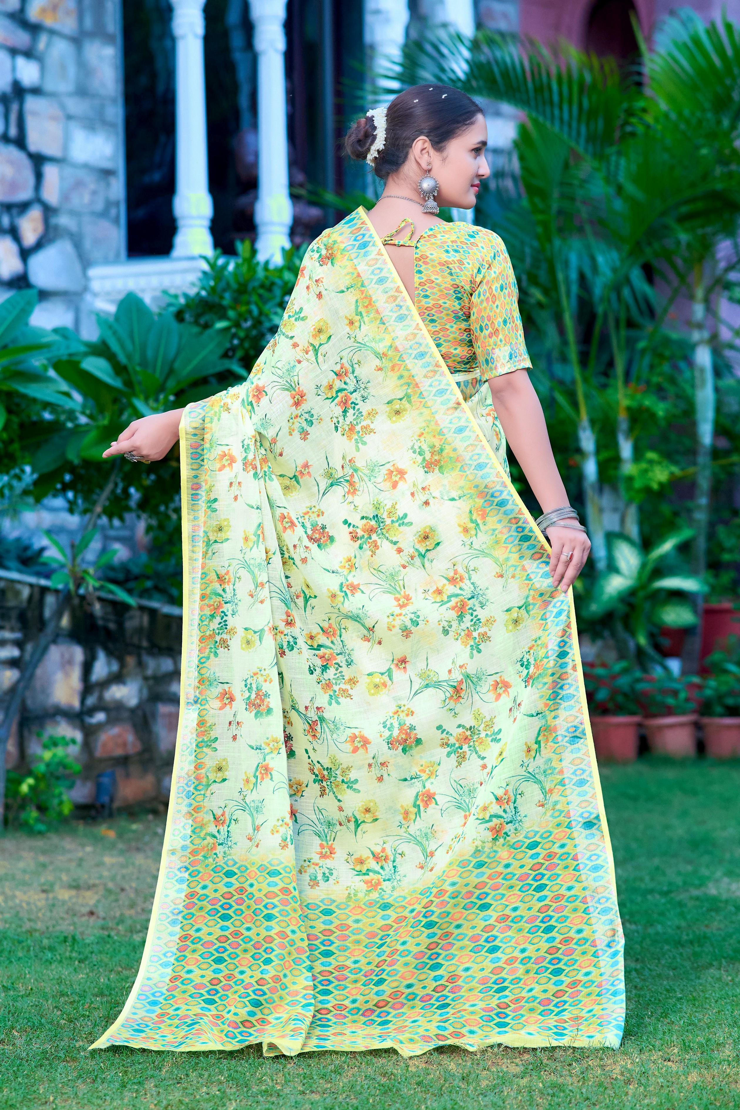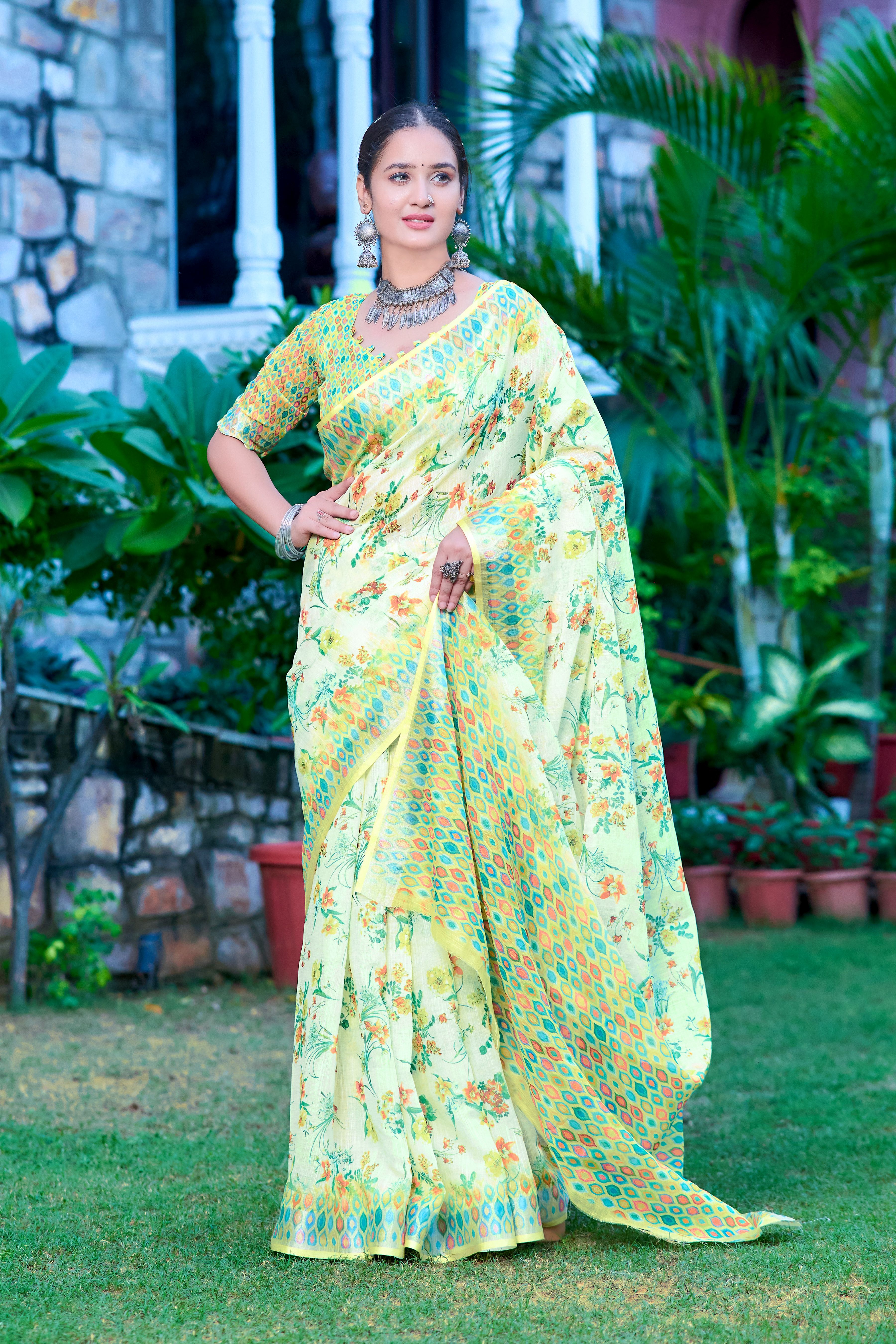 Garb These Festive Saree in Fine Colored.These Saree Are Linen Cotton And Blouse is Fabricated On Linen Cotton Pair.Its Beautified With Wevon Jari Border With Designer Digital Printed.