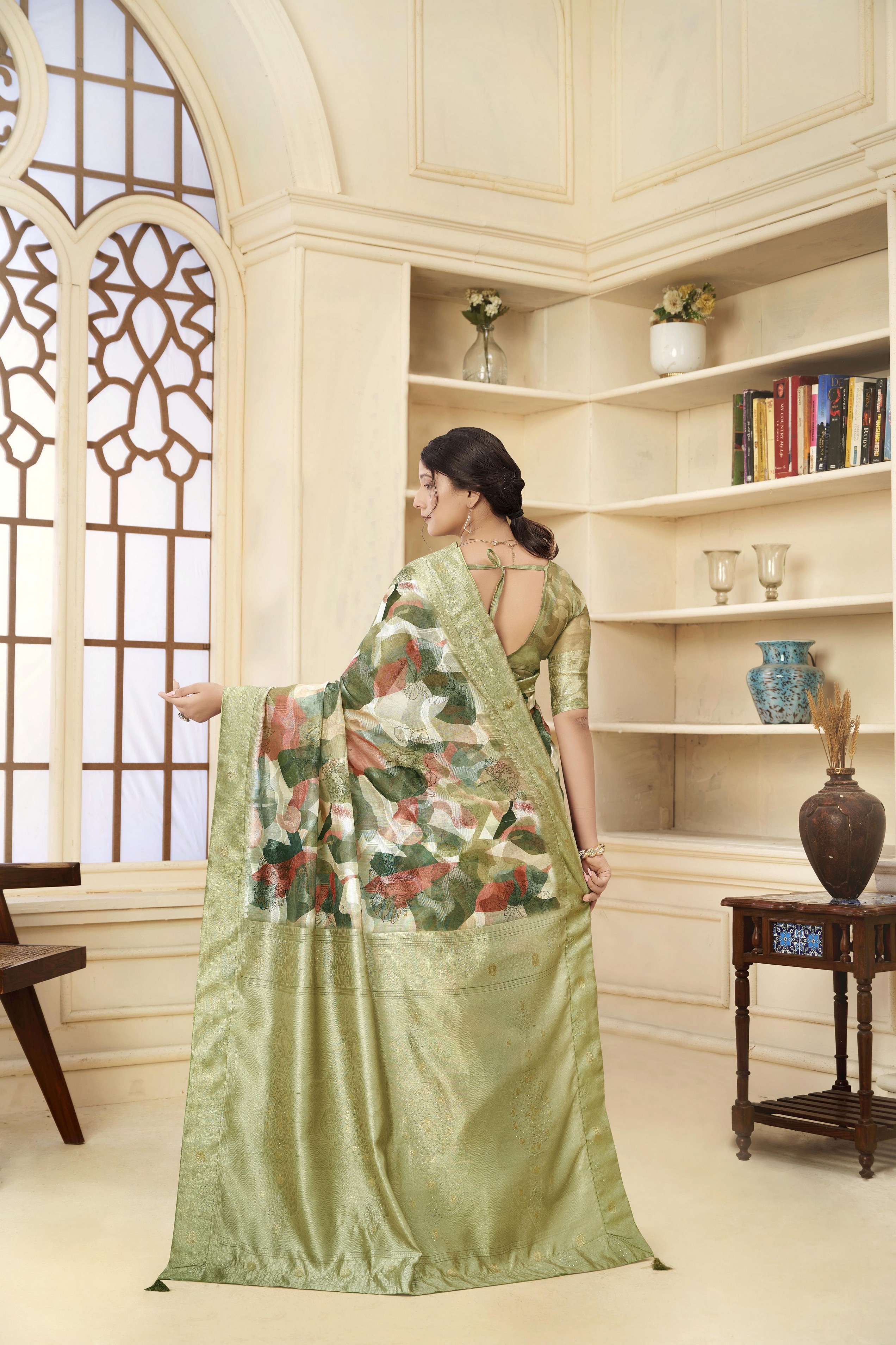 Pista Color Wevon Jacquard Designer With Printed Rich Silk Fabric Stylish Ceremonial Saree