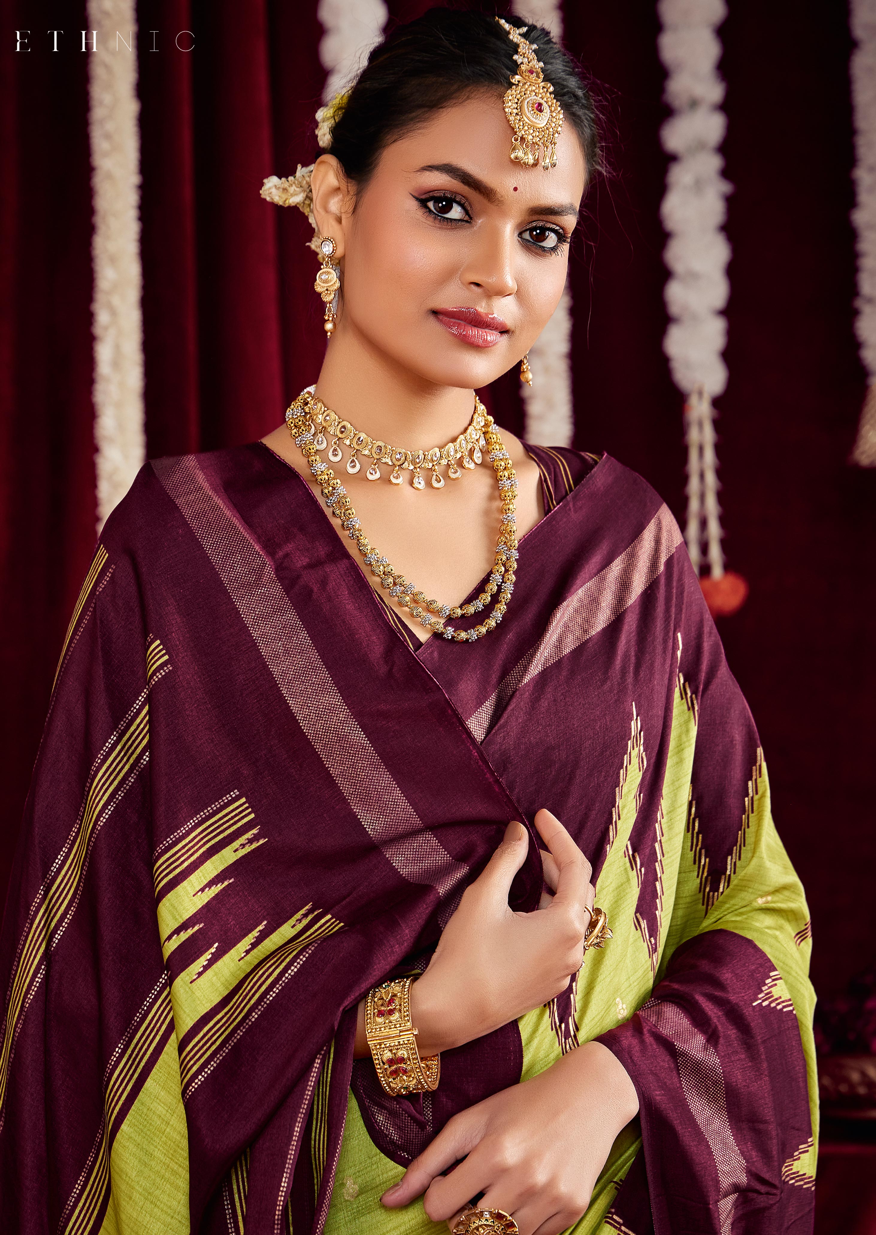 Pista Green & Wine Color Ikkat Silk Fabric Designer Zig Zag Printed Traditional Party Looks Saree