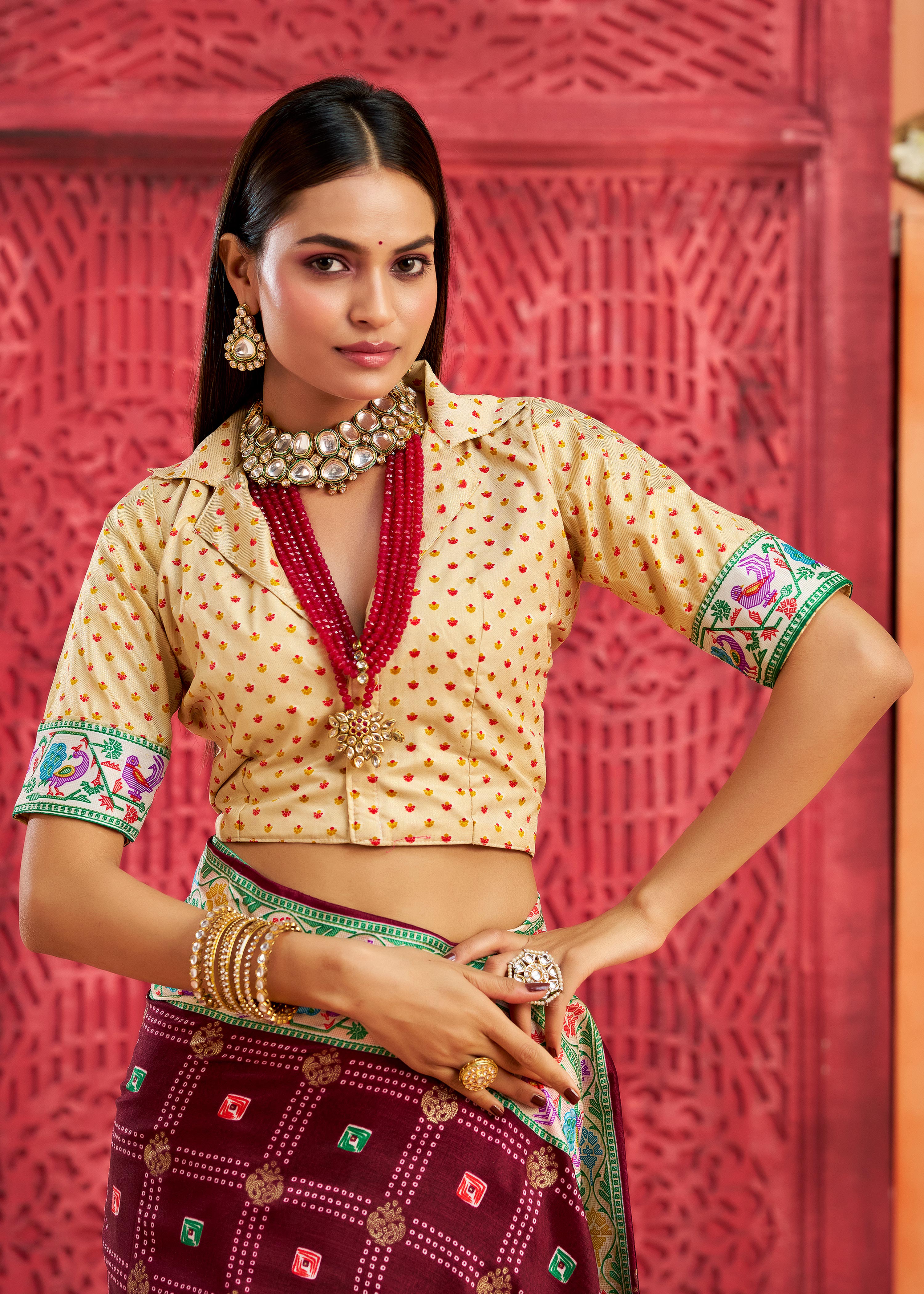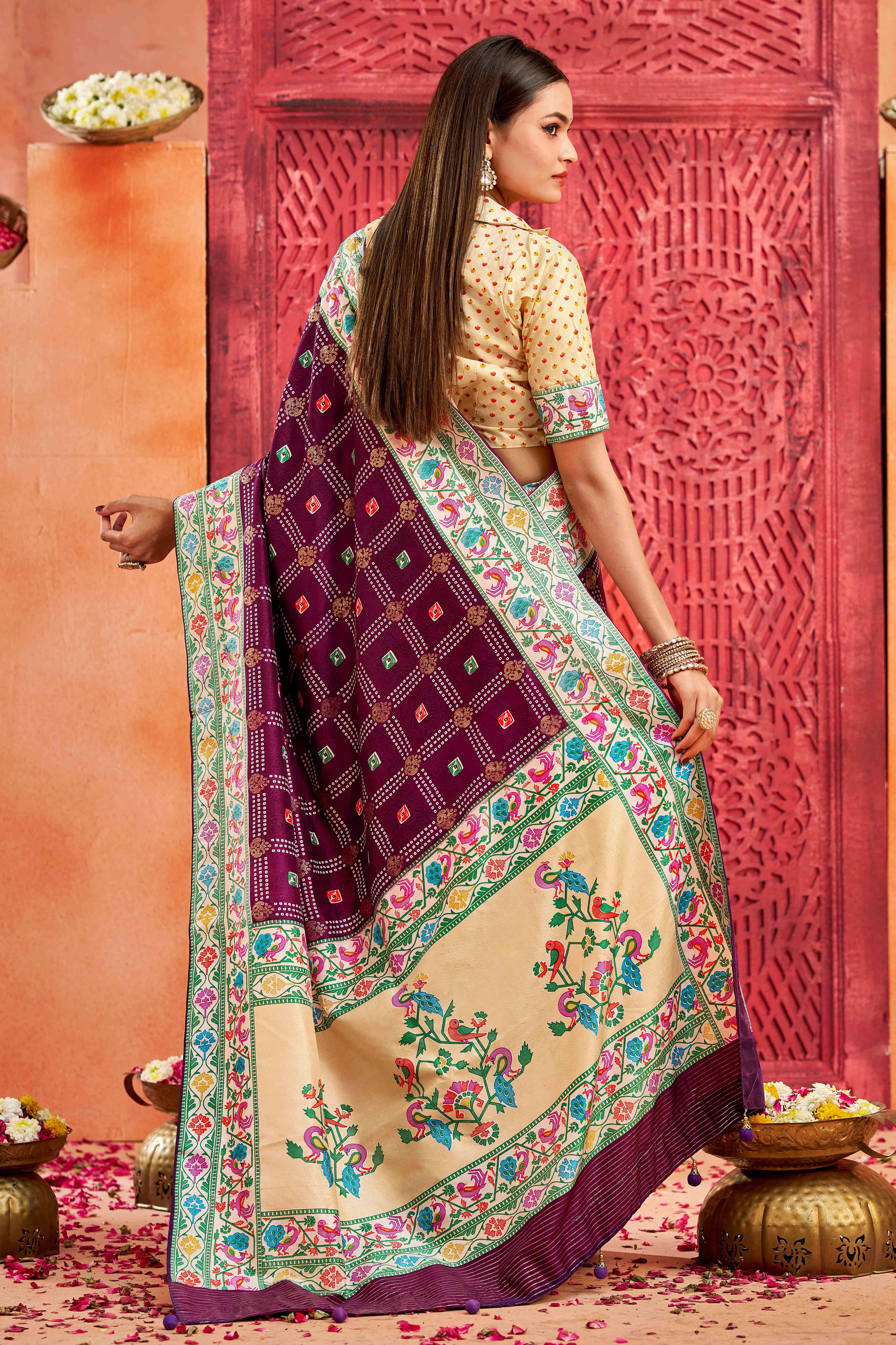 Plum Color Velvet Tussar Silk Fabric Partywear Saree With Paithani Pallu And Traditional Ghatchola Print