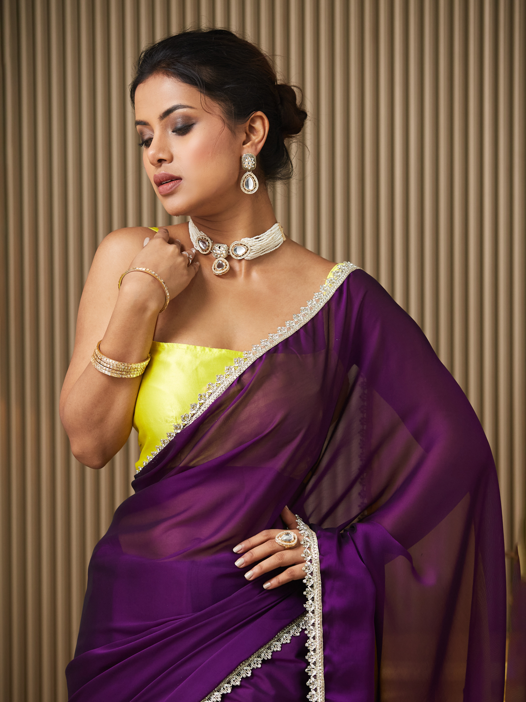 Purple Color Chiffon fabric Mirrorwork Colorblocked Work Ceremonial Saree