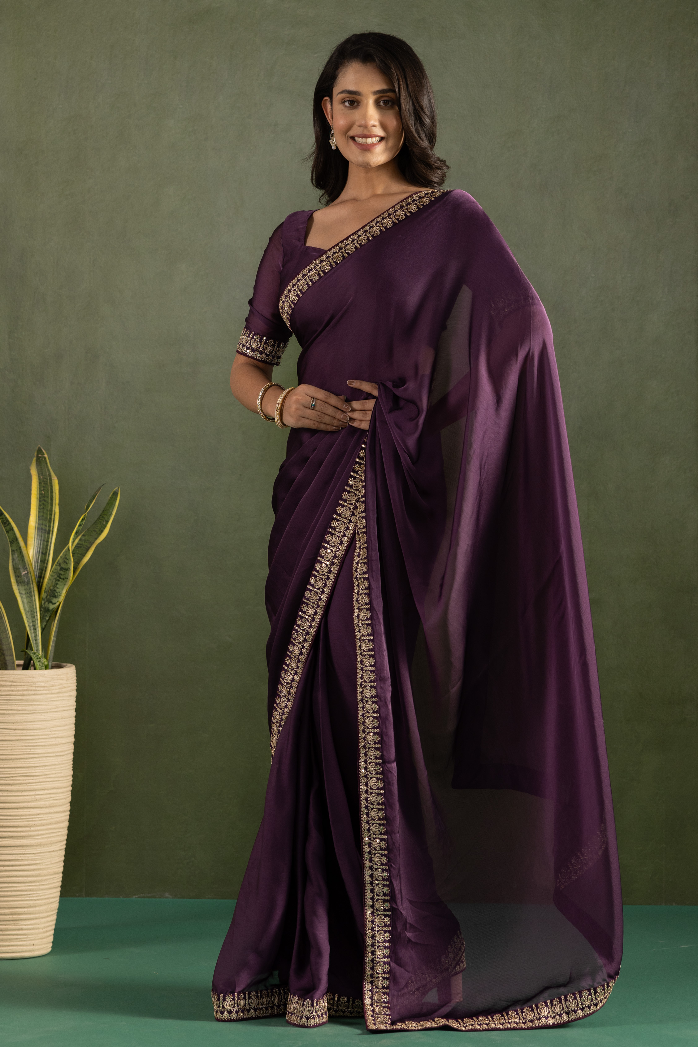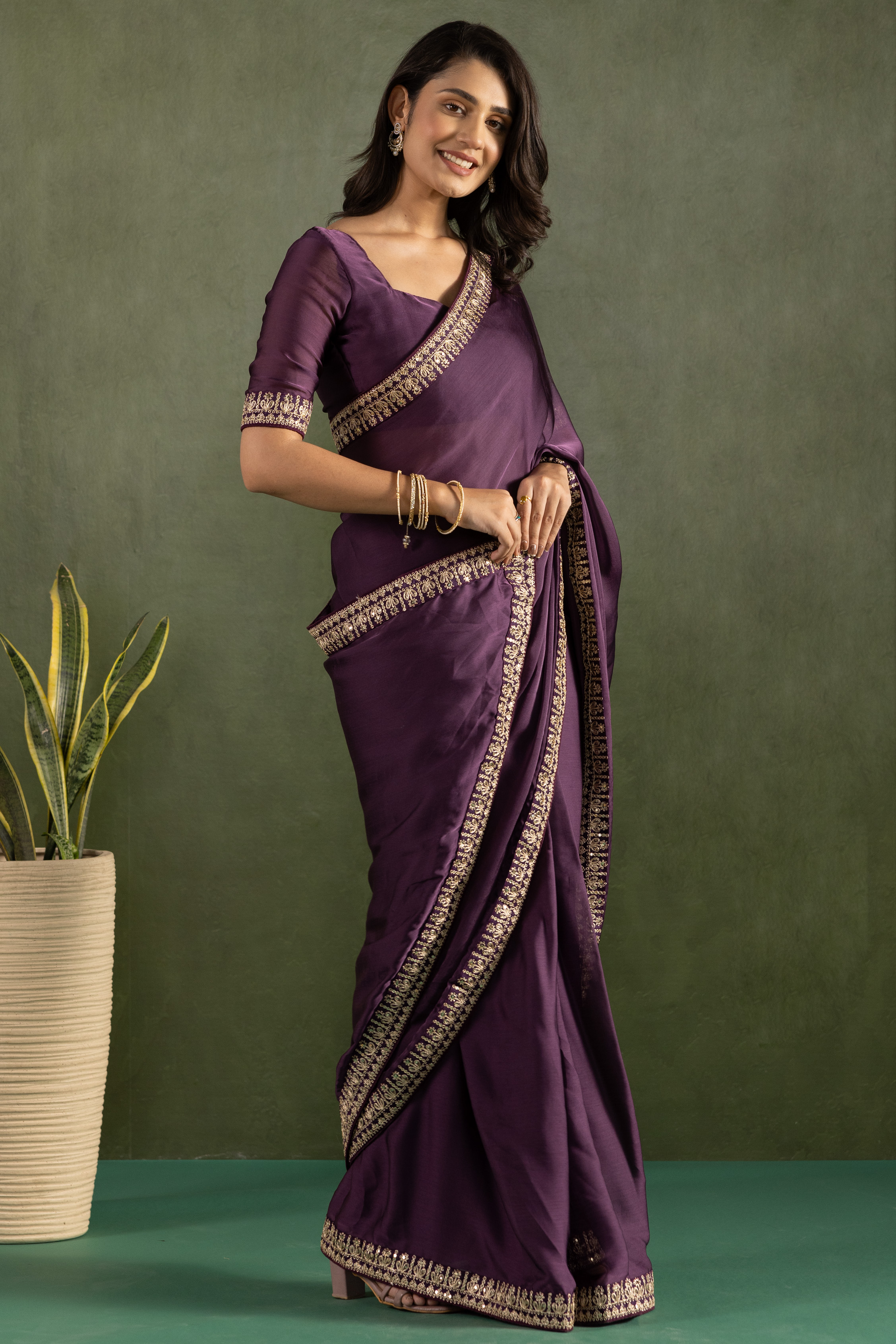 Purple Color Chiffon Fabric Ready To Wear Designer Solid Partywear Saree