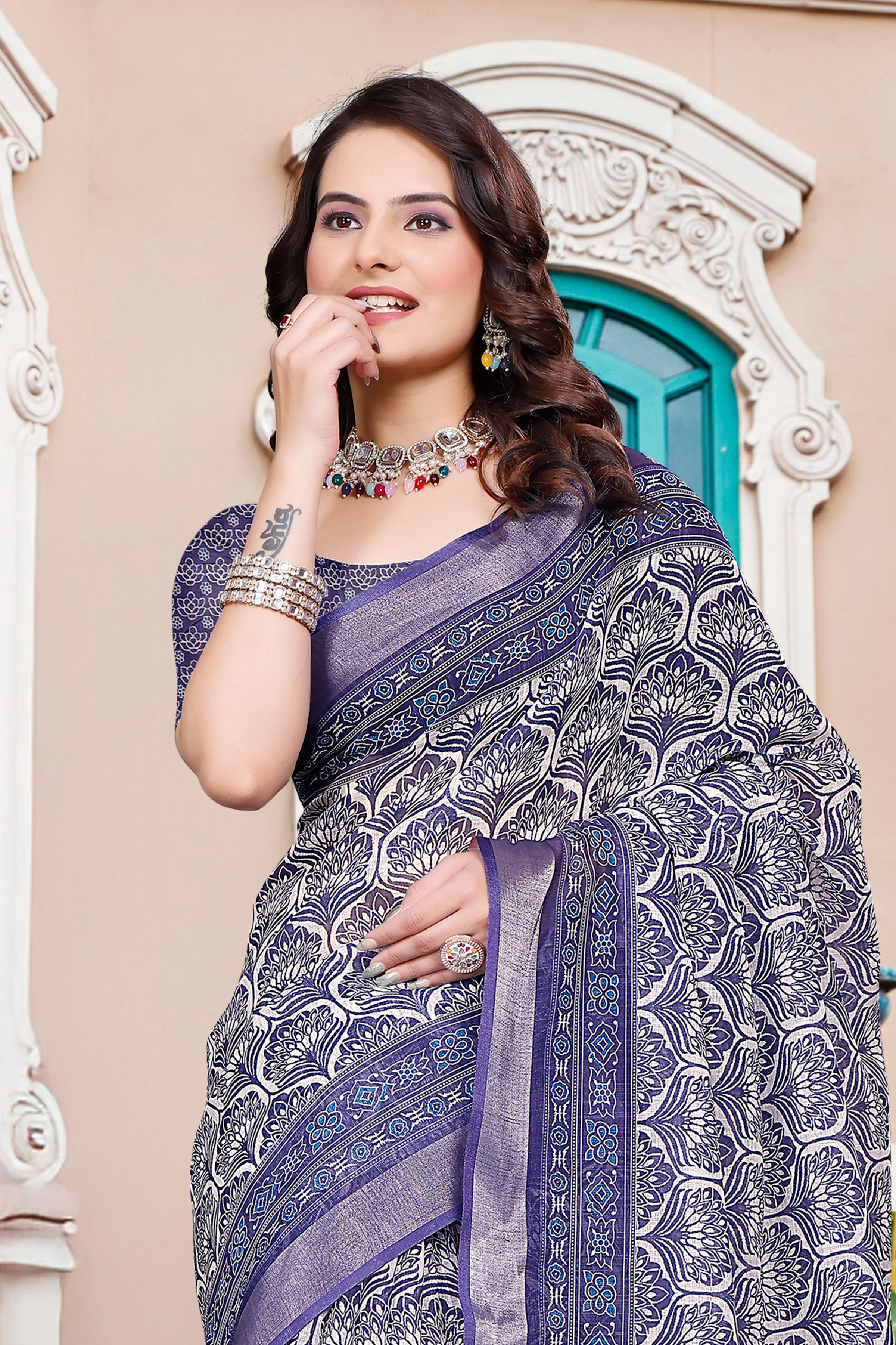 Purple Color Linen Cotton Saree With Smart Partywear Printed Looks
