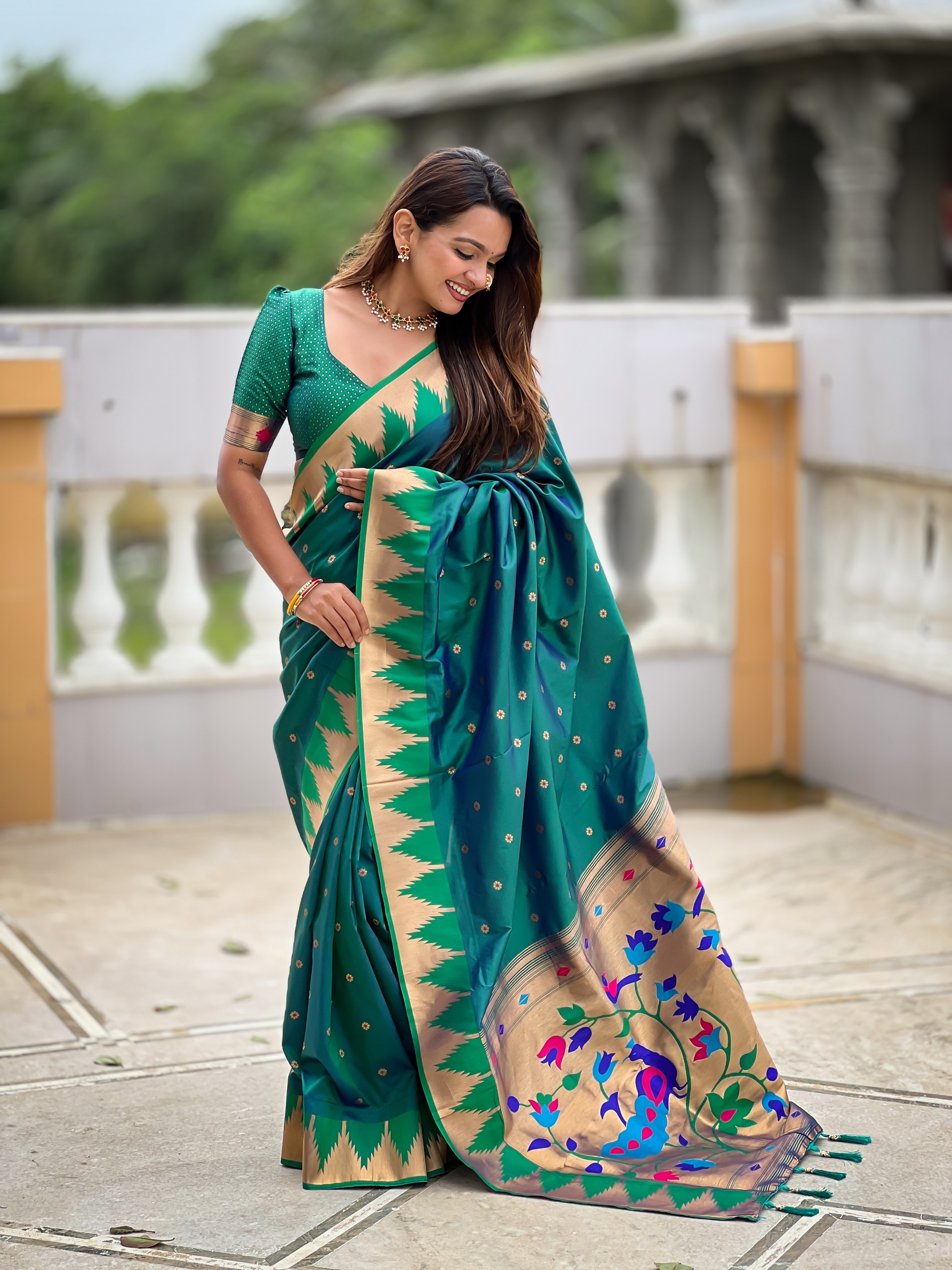 Rama Color Sophisticated Paithani Silk Fabric Woven Jacquard Meenakari Designer Saree