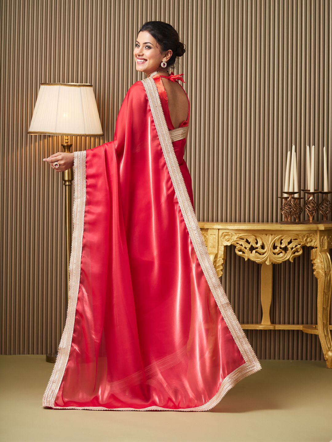 Red Color Organza fabric Designer Lace Work Ceremonial Saree