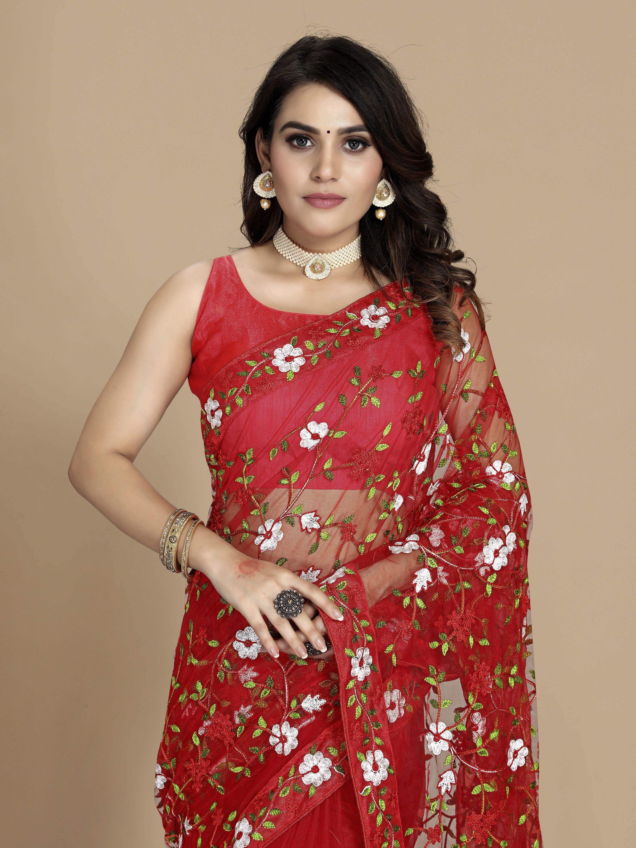 Red Color Soft Net Fabric Designer Multy Thread Embroidery Work Smart Partywear Saree