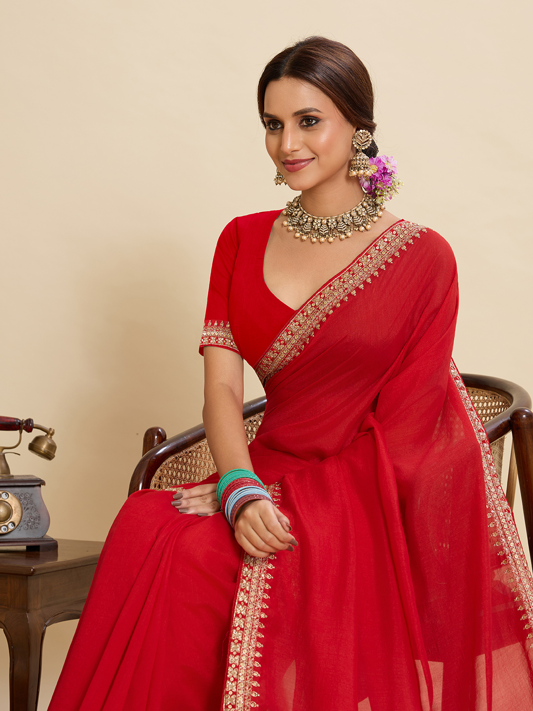 Red Color Vichitra Silk Fabric Beautiful Partywear Saree