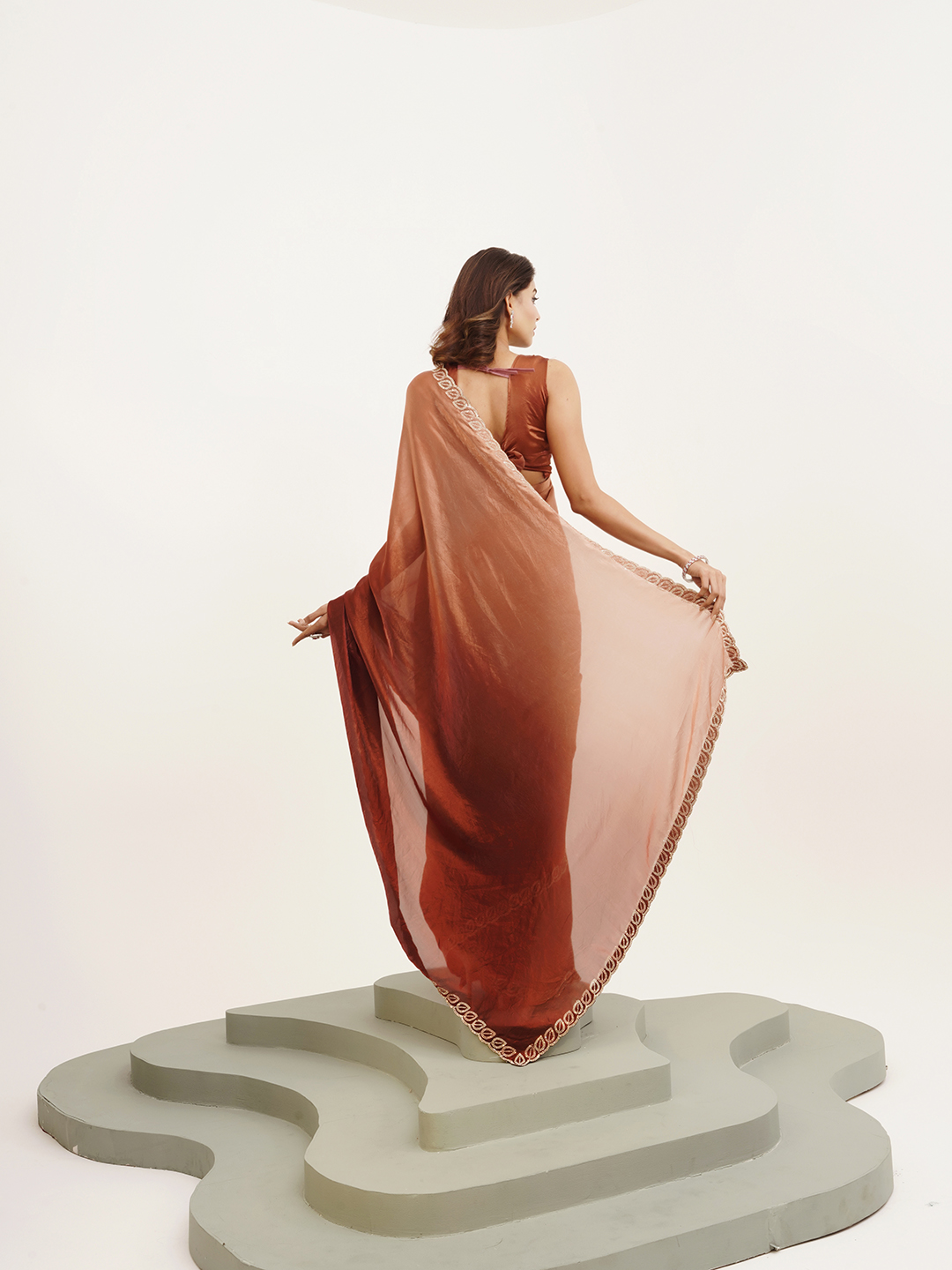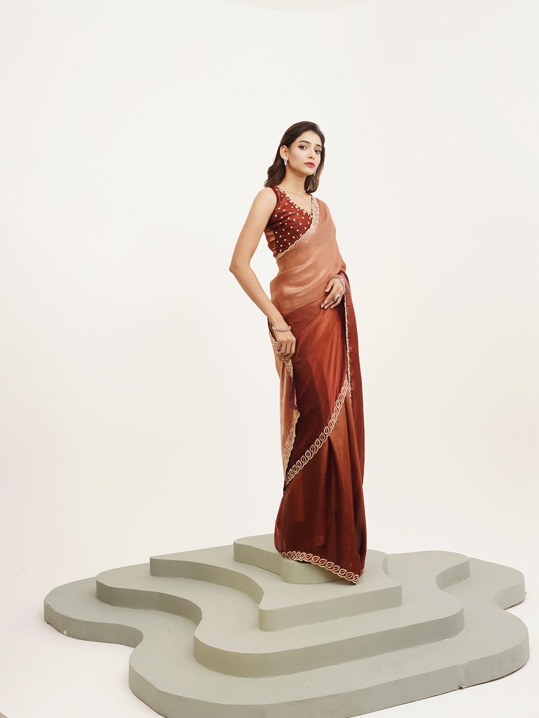 Rust Color Satin Fabric Embellished Beads and Stones Work Fancy Saree