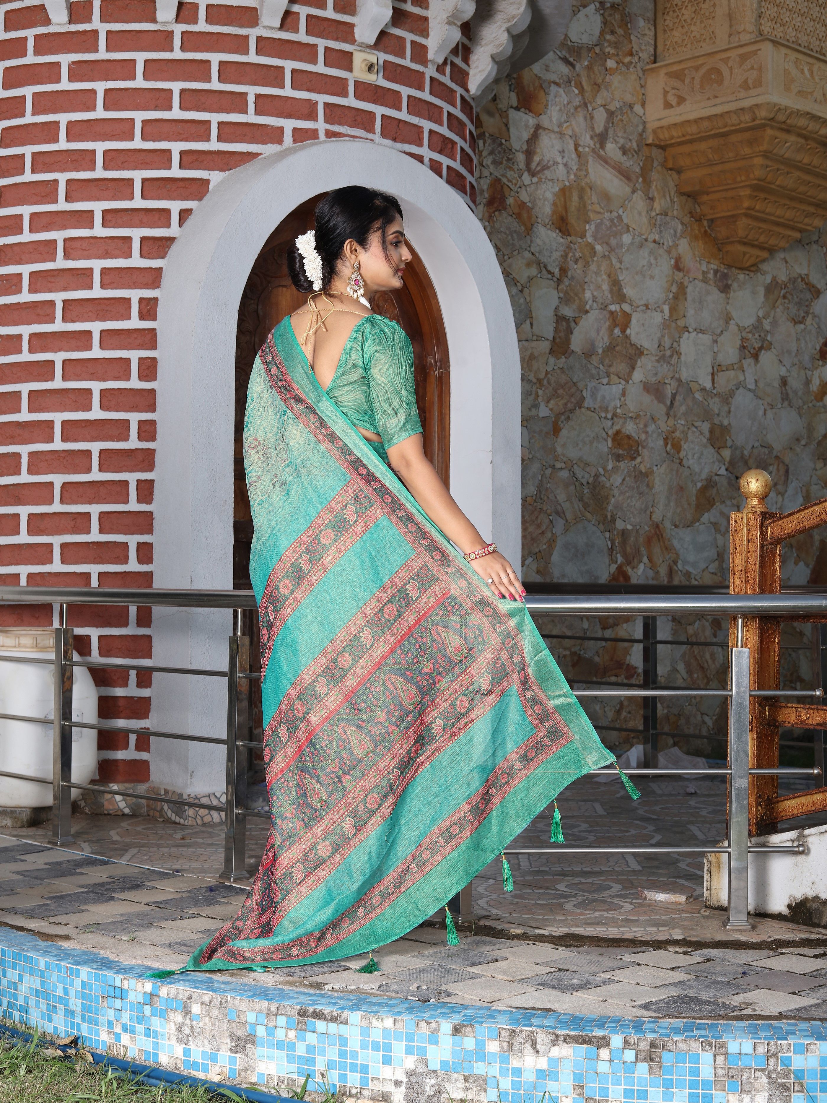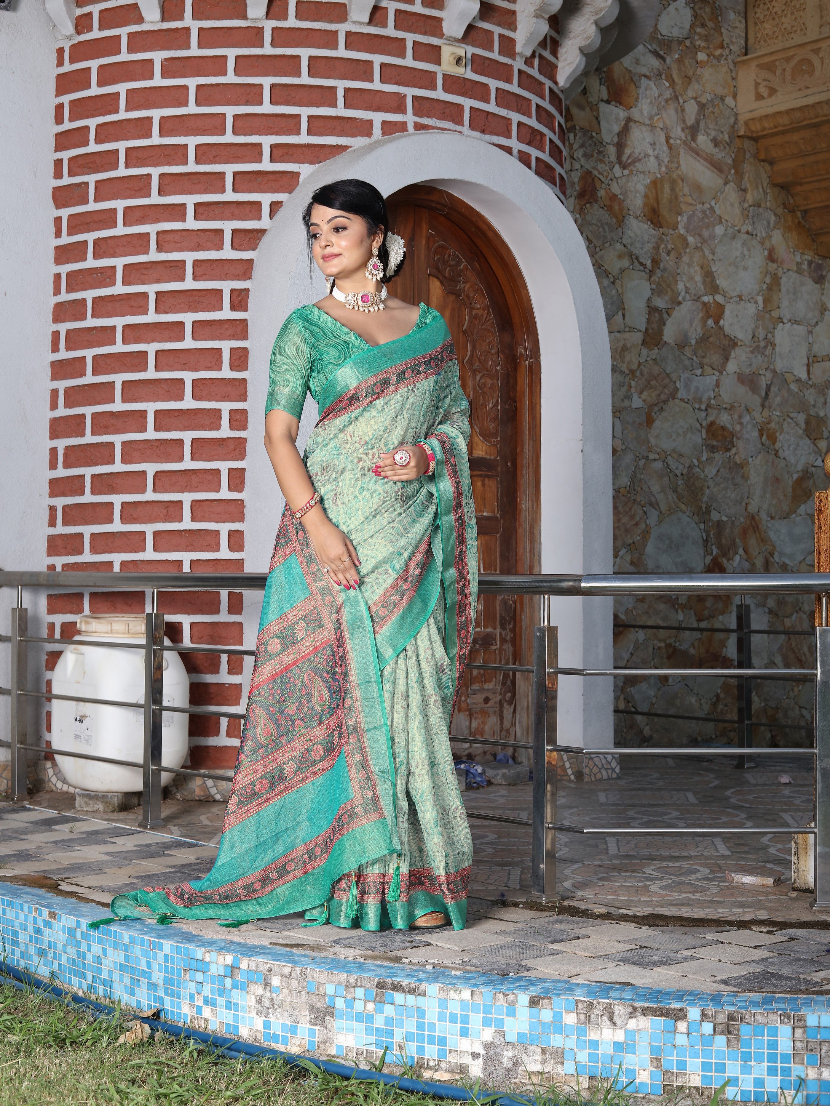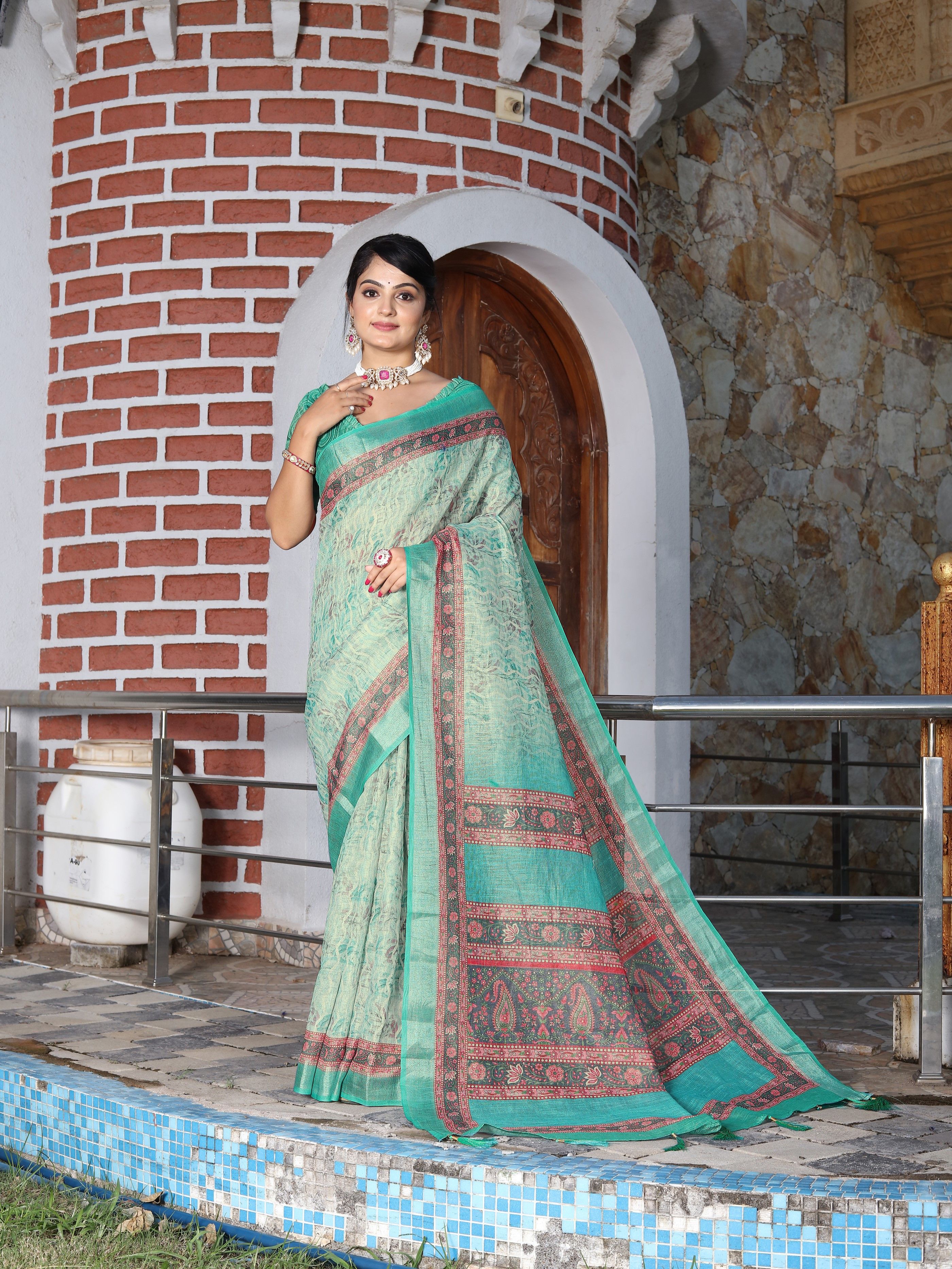 Sea Green Color Cotton Shimmer Fabric Designer Printed Ethnic Girlie Saree