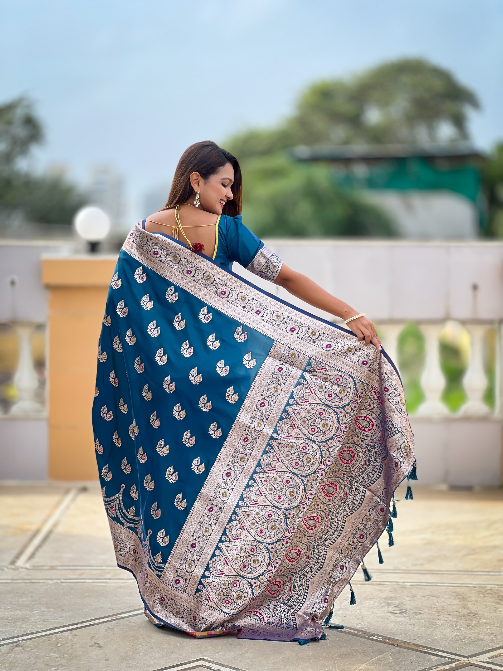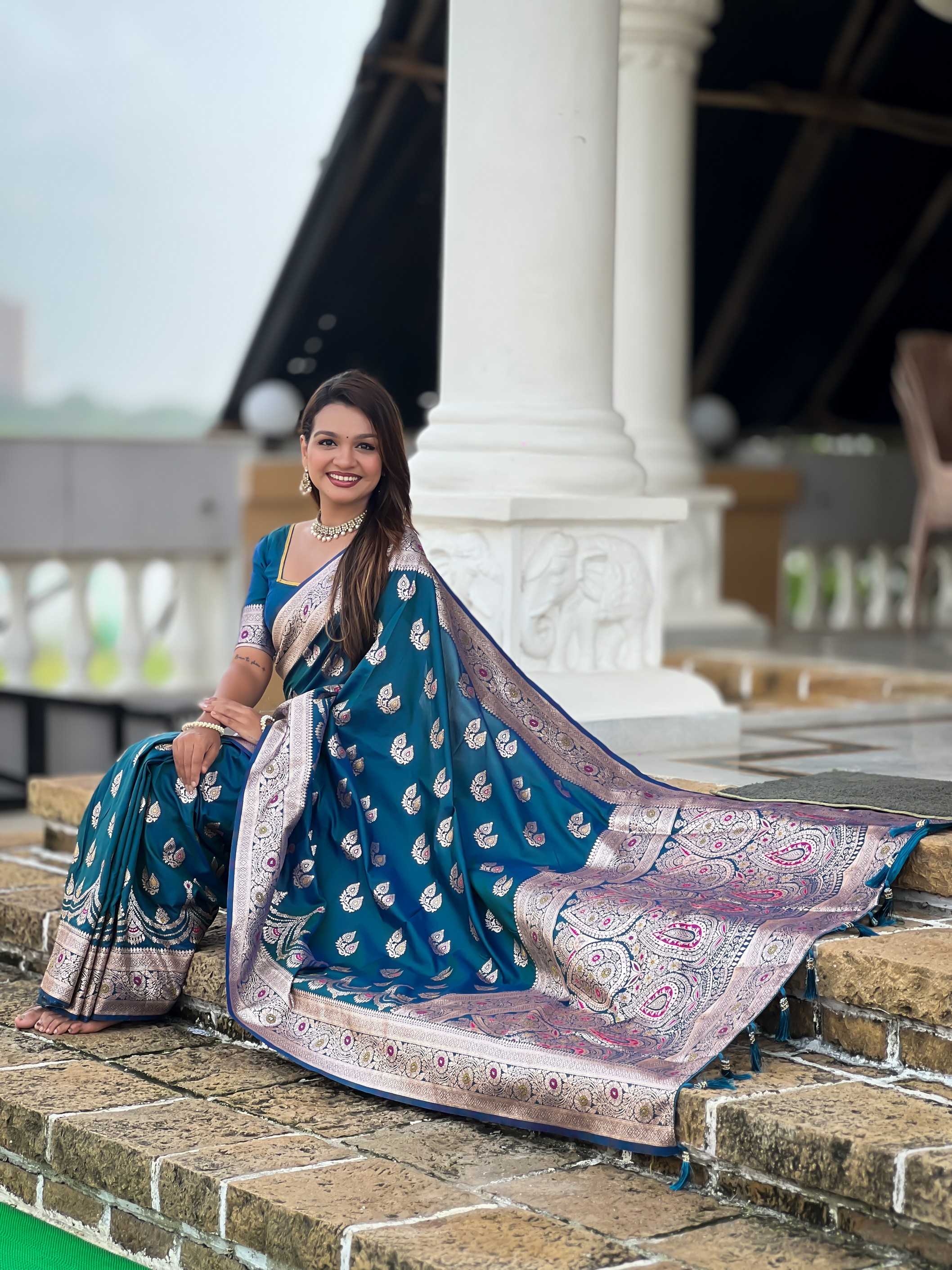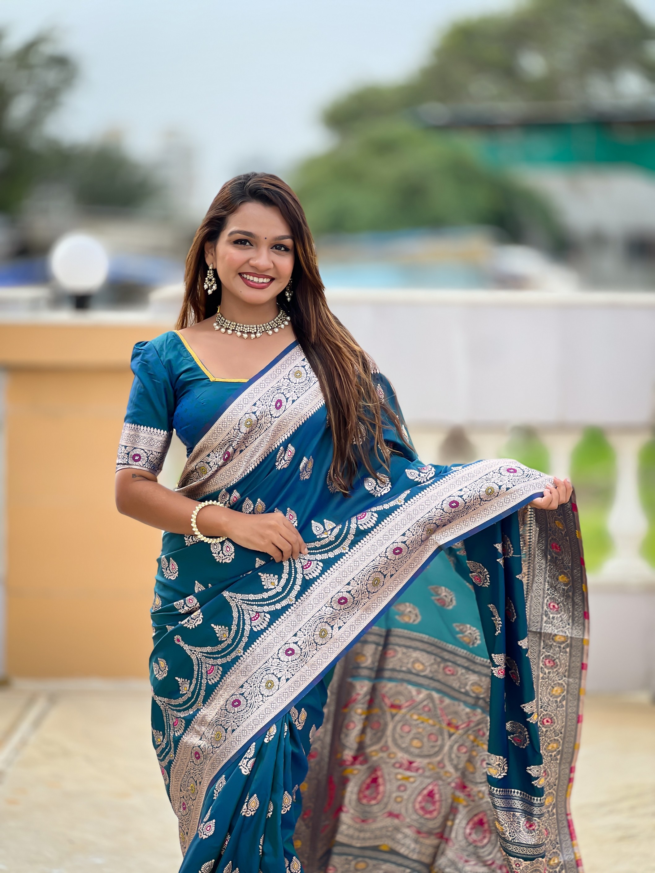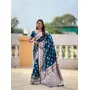 Teal Blue Color Banarasi Silk Saree With Woven Jacquard Designer Ethnic Style