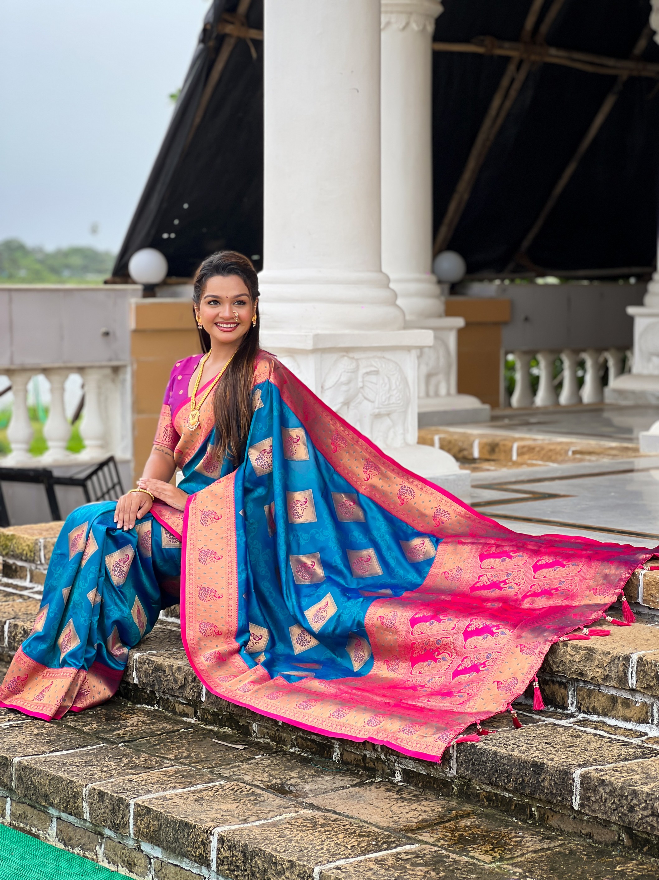 Teal Blue Color Beautiful Woven Designer Meenakari Banarasi Silk Saree