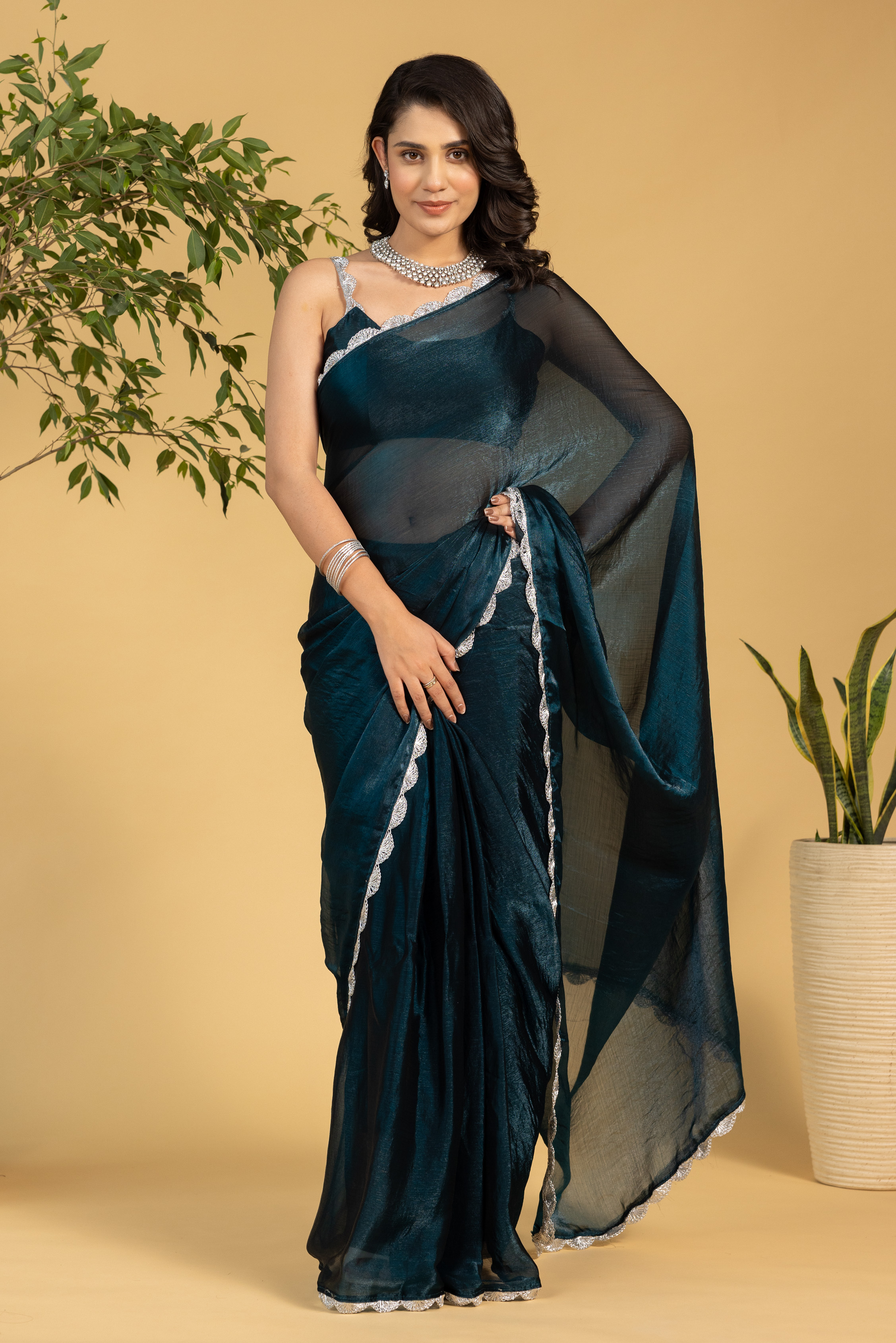 Teal Blue Color Chiffon Fabric Ready To Wear Saree For Graceful Bollywood Style Saree