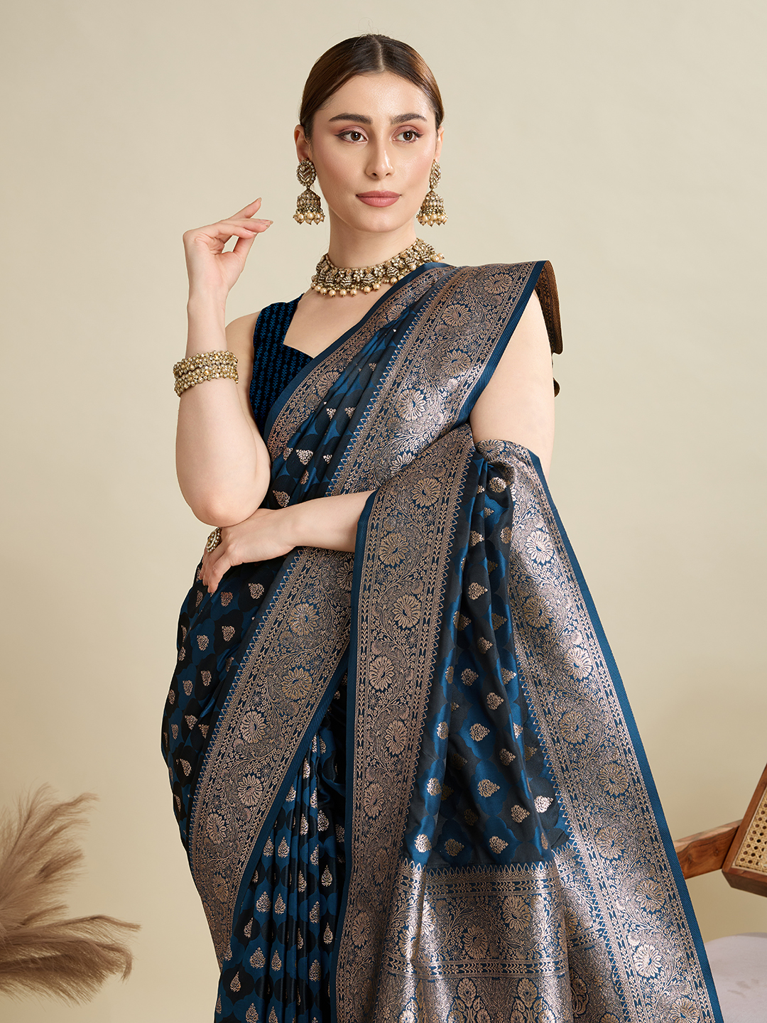 Teal Blue Color Satin Silk Wevon Jari Designer Graceful Ethnic Saree