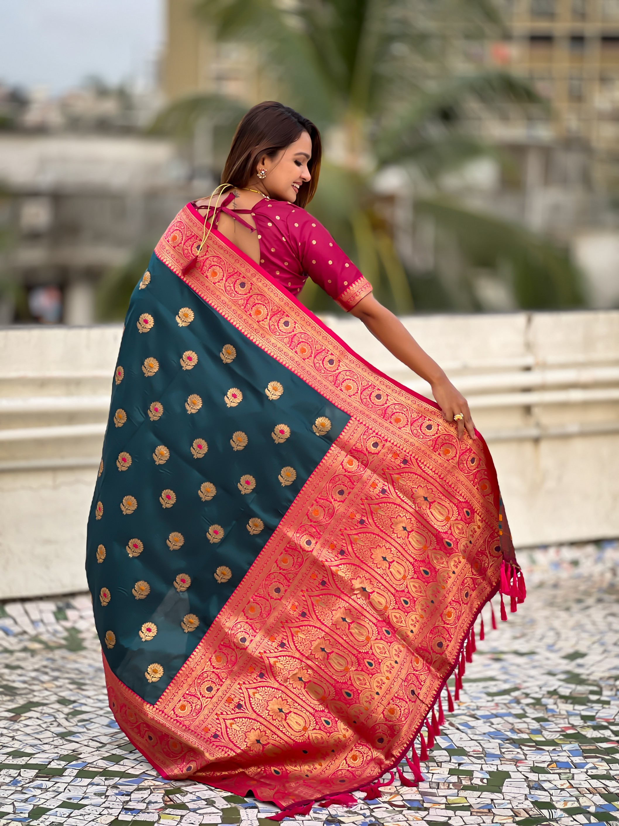Teal Blue Color Soft Silk Fabric Wevon Meenakari Designer Trending Partywear Saree