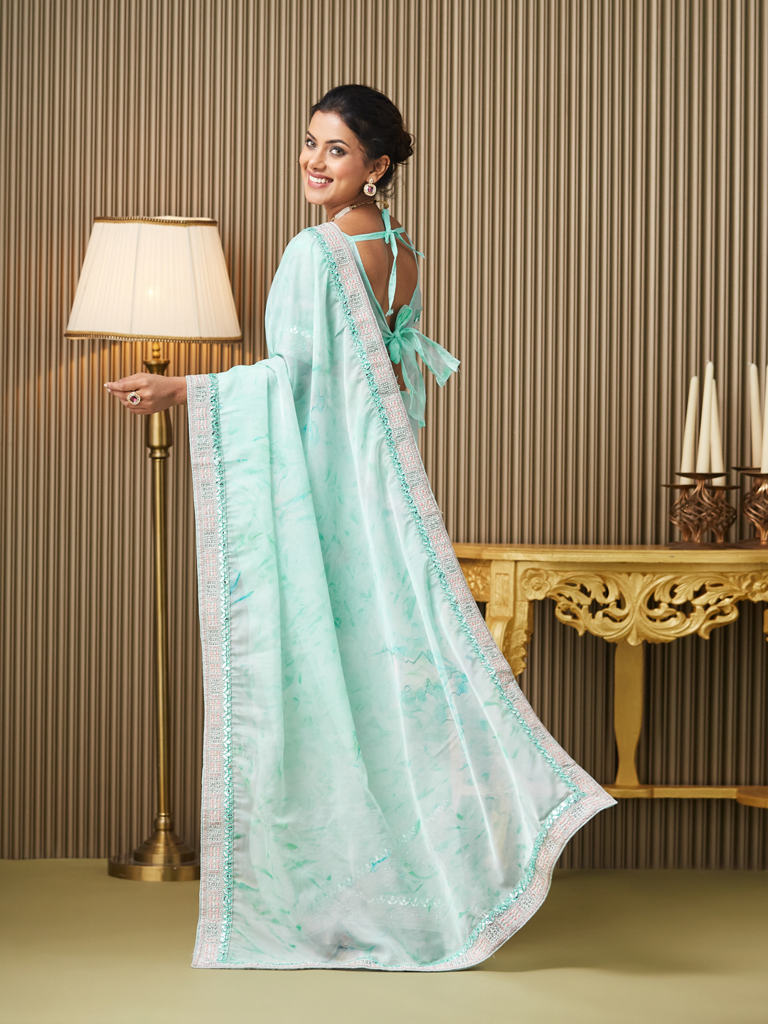 Turquoise Blue Color Organza fabric Embroidered Embellished Work Ceremonial Saree