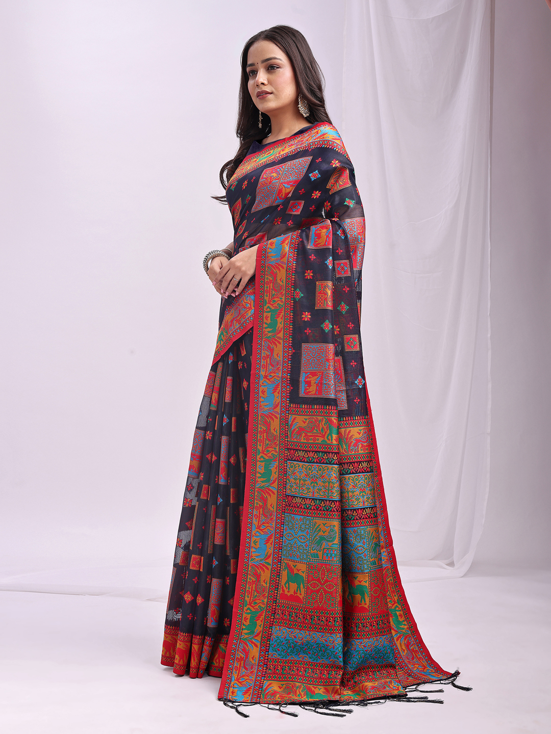 Wevon Thread Designer Navy Blue Color Linen Cotton Fabric Traditional Rich Looks Saree