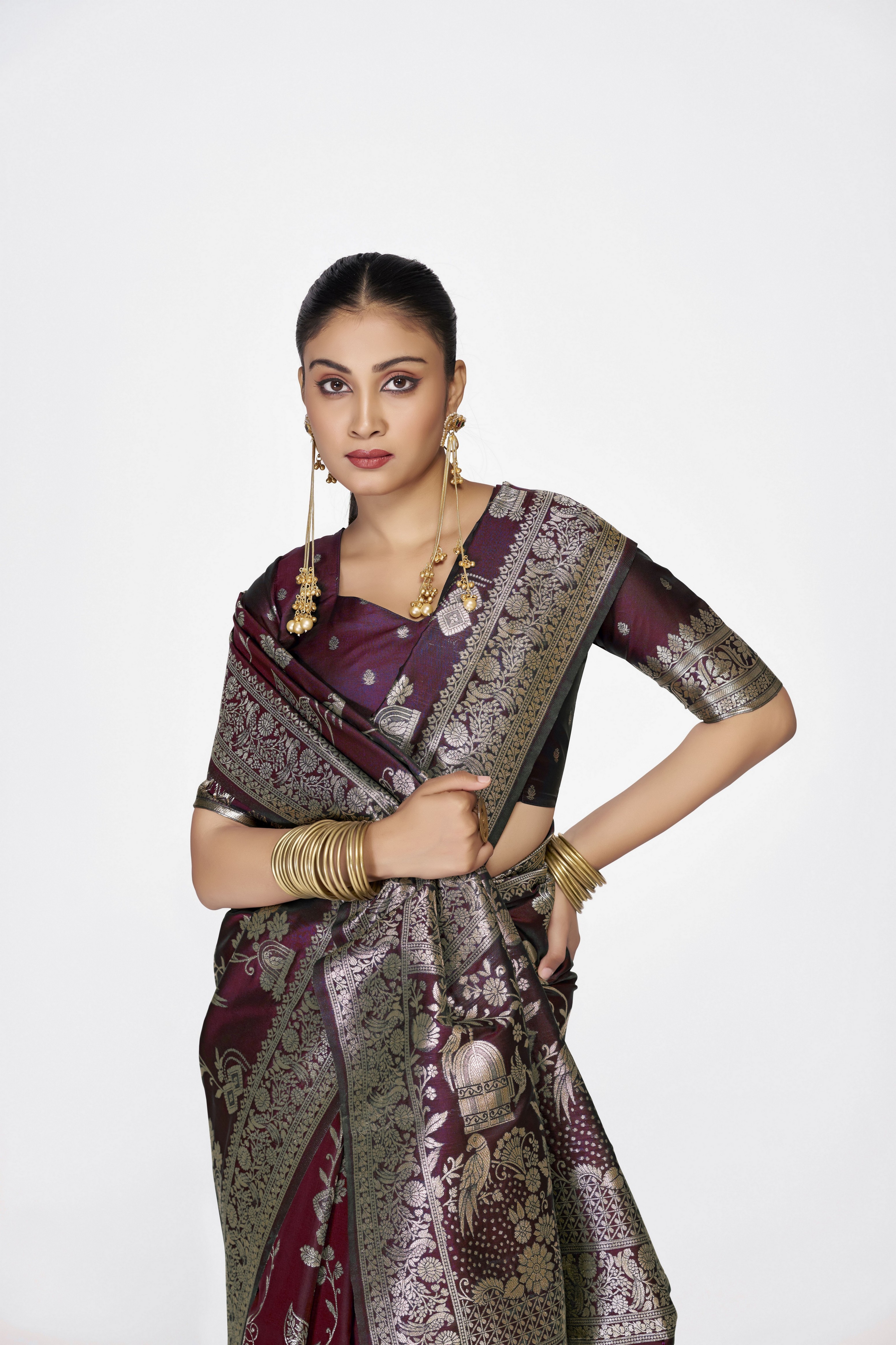 Wine Color Banarasi Silk Fabric Woven Jari Designer Ceremonial Partywear Saree