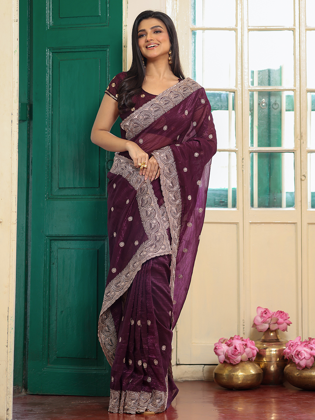 Wine Color Designer Chiffon Fabric Saree For Ceremonial Looks
