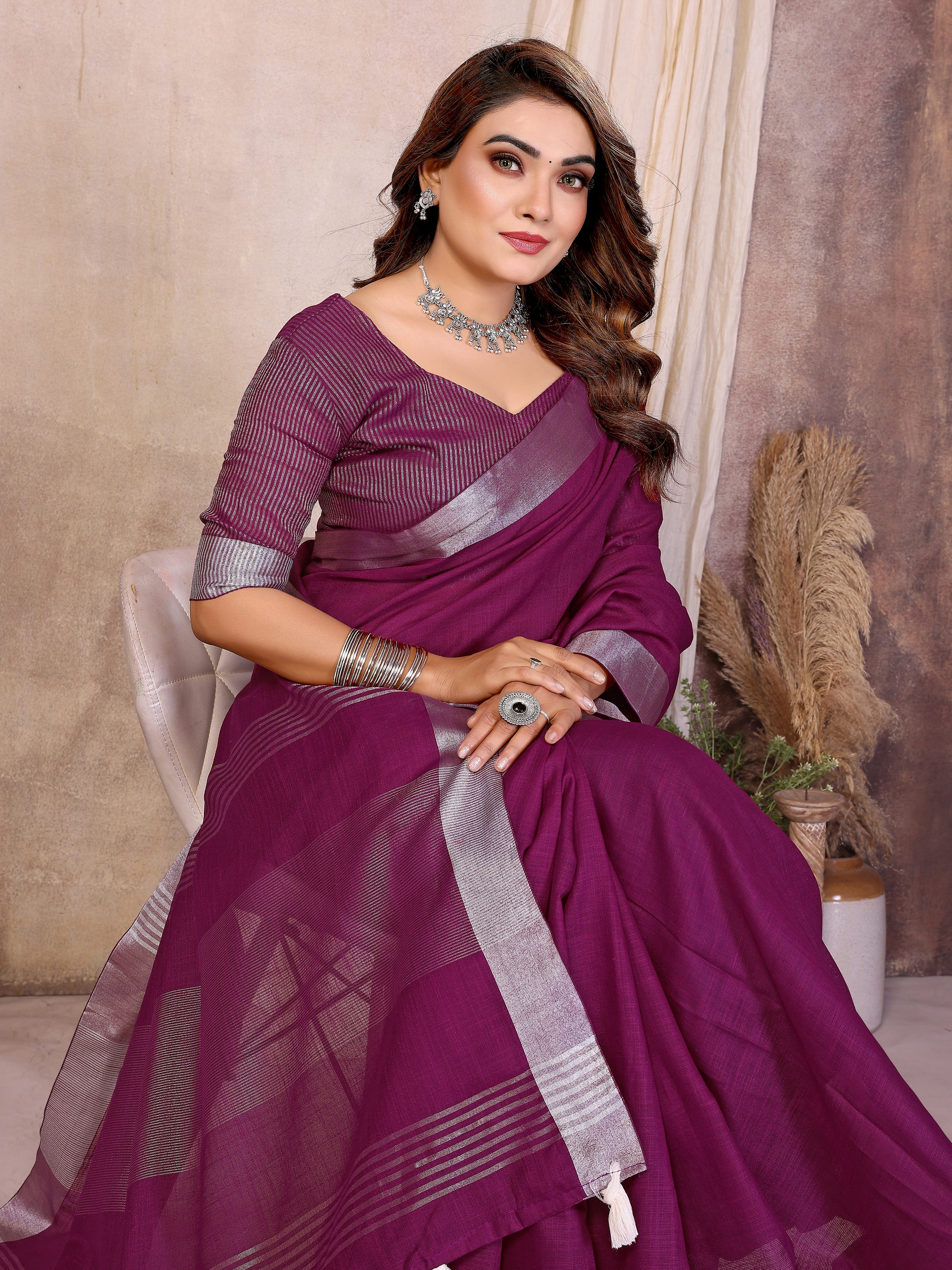 Wine Color Linen Cotton Fabric Woven Silver Jari Designer Ceremonial Saree