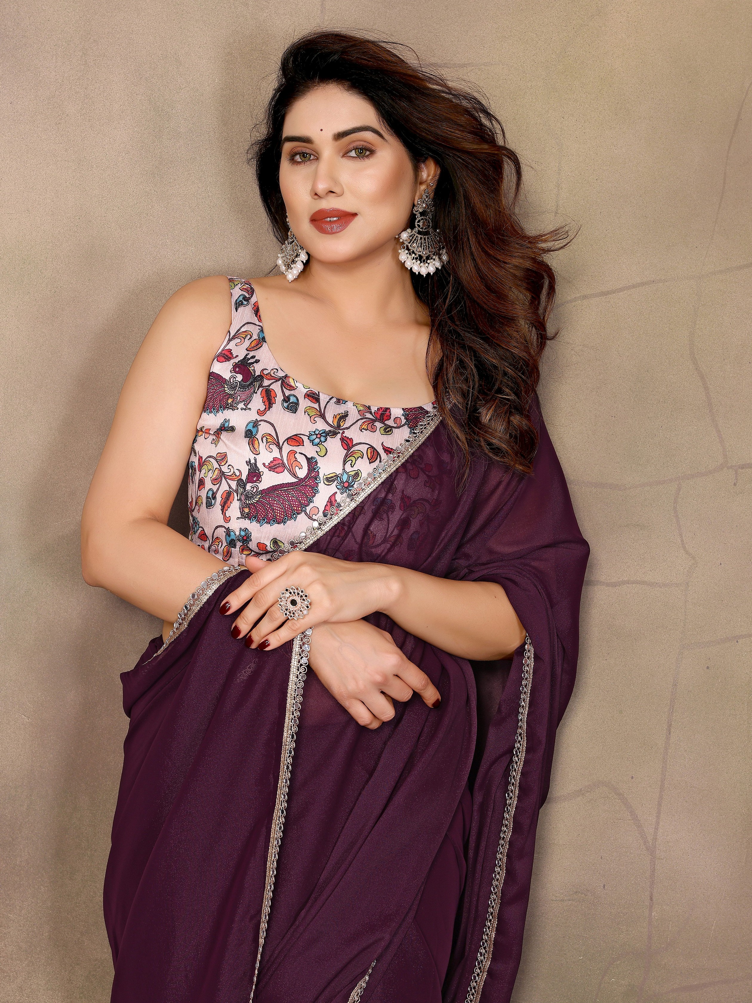 Wine Color Solid Color Fancy Ethnic Saree For Ceremonial Girlie Looks