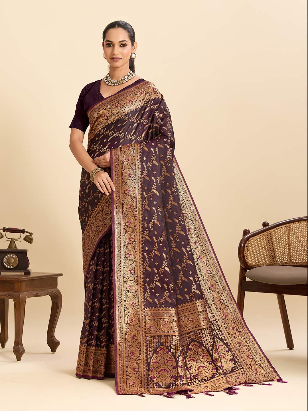 Wine Color Wevon Jari Designer Soft Silk Partywear Saree