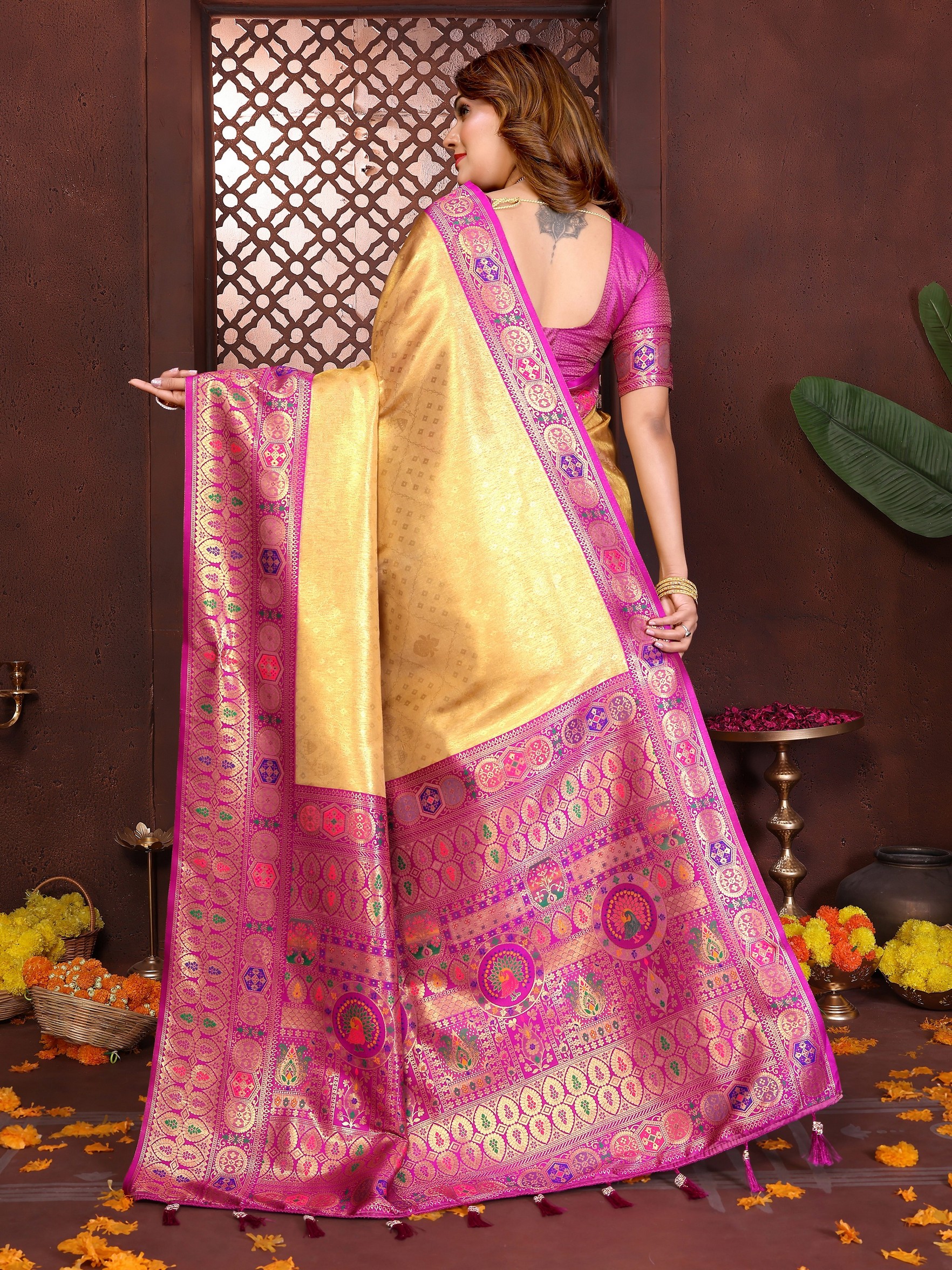 Yellow Color Banarasi Tissue Silk Fabric Woven Rich Paithani Designer Saree
