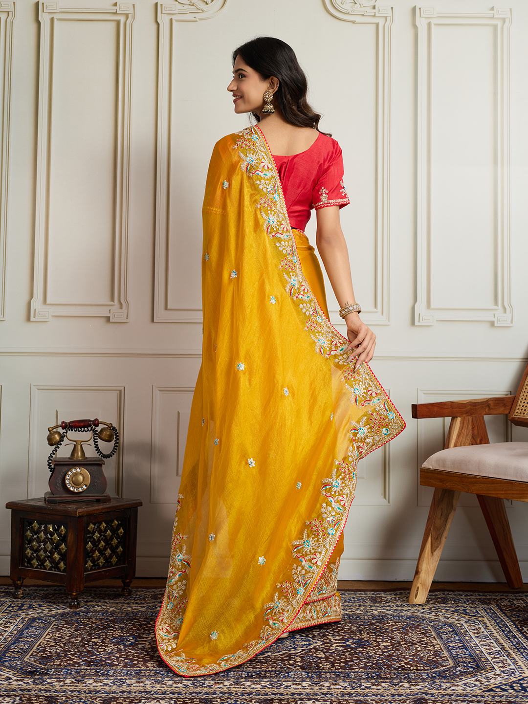 Yellow Color Frendy Chiffon Fabric Designer Embroidery Work Heavy Ceremonial Saree