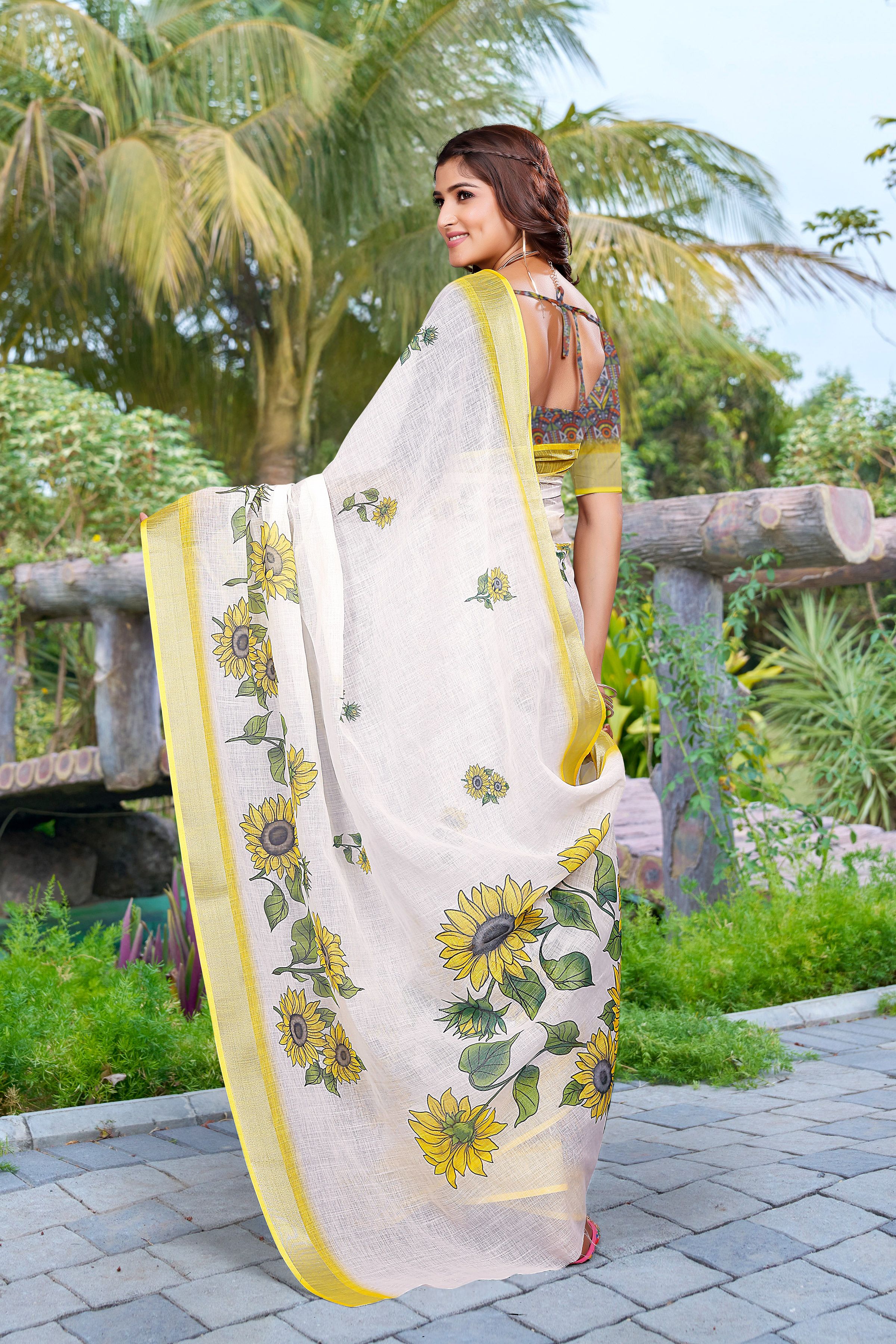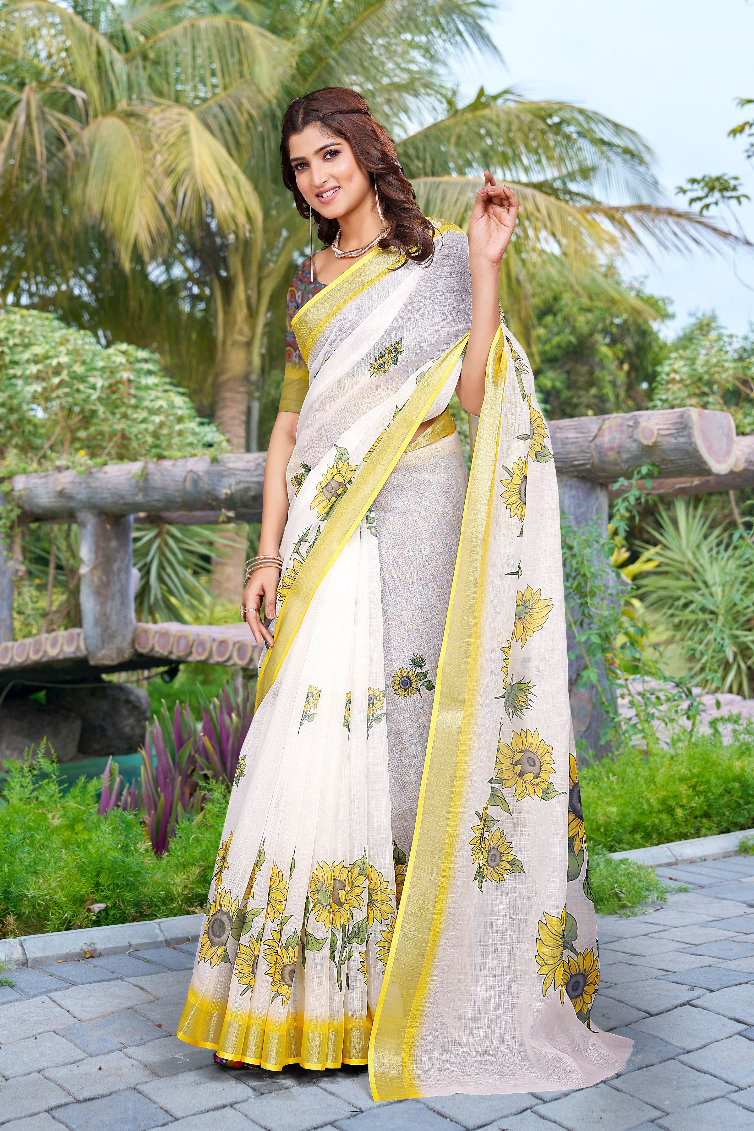 Garb These Festive Saree in Fine Colored.These Saree Are Linen Cotton And Blouse is Fabricated On Linen Cotton Pair.Its Beautified With Wevon Jari Border With Designer Digital Printed.