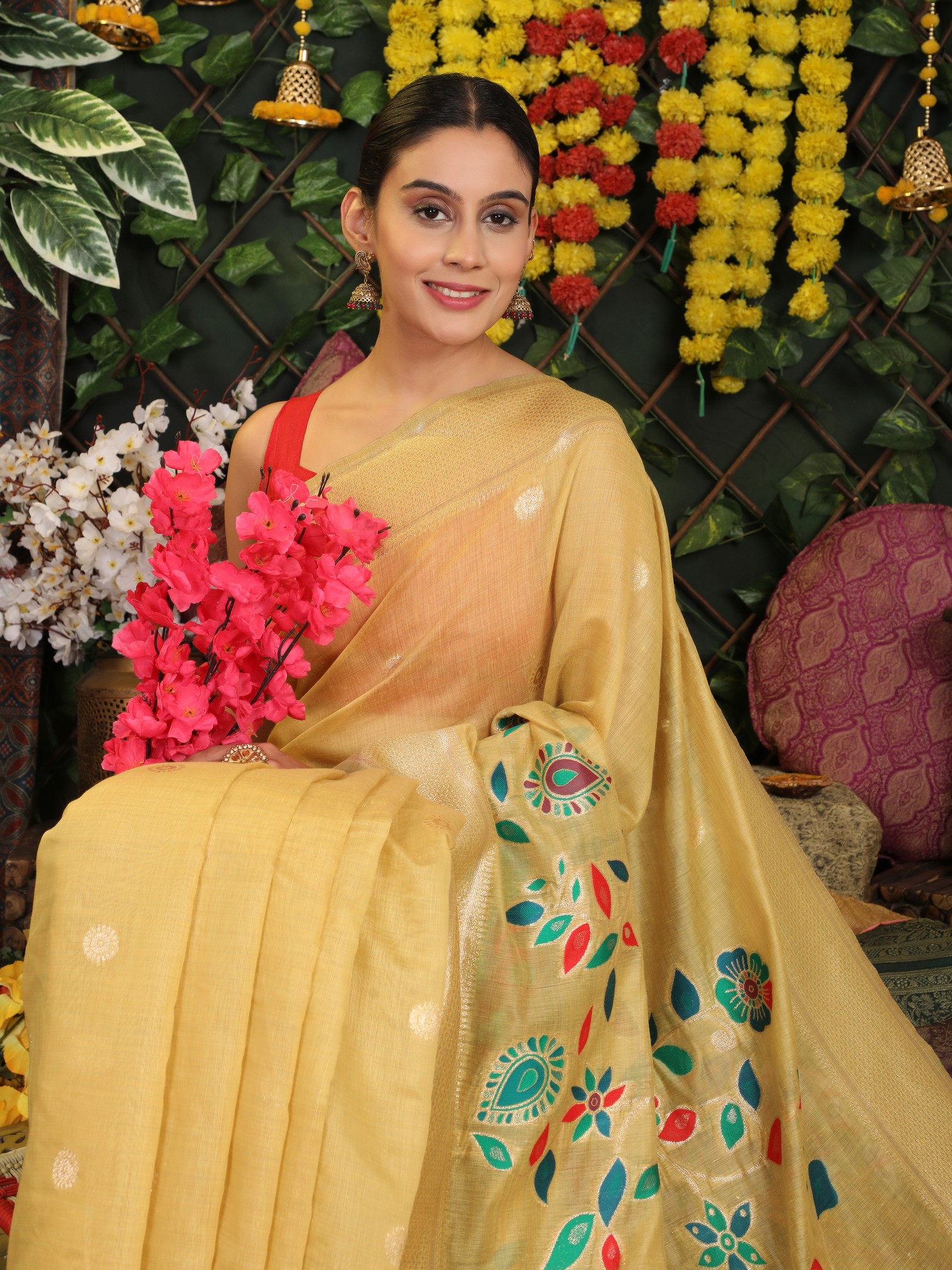Yellow Color Linen Cotton Fabric Beautiful Woven Designer Partywear Saree