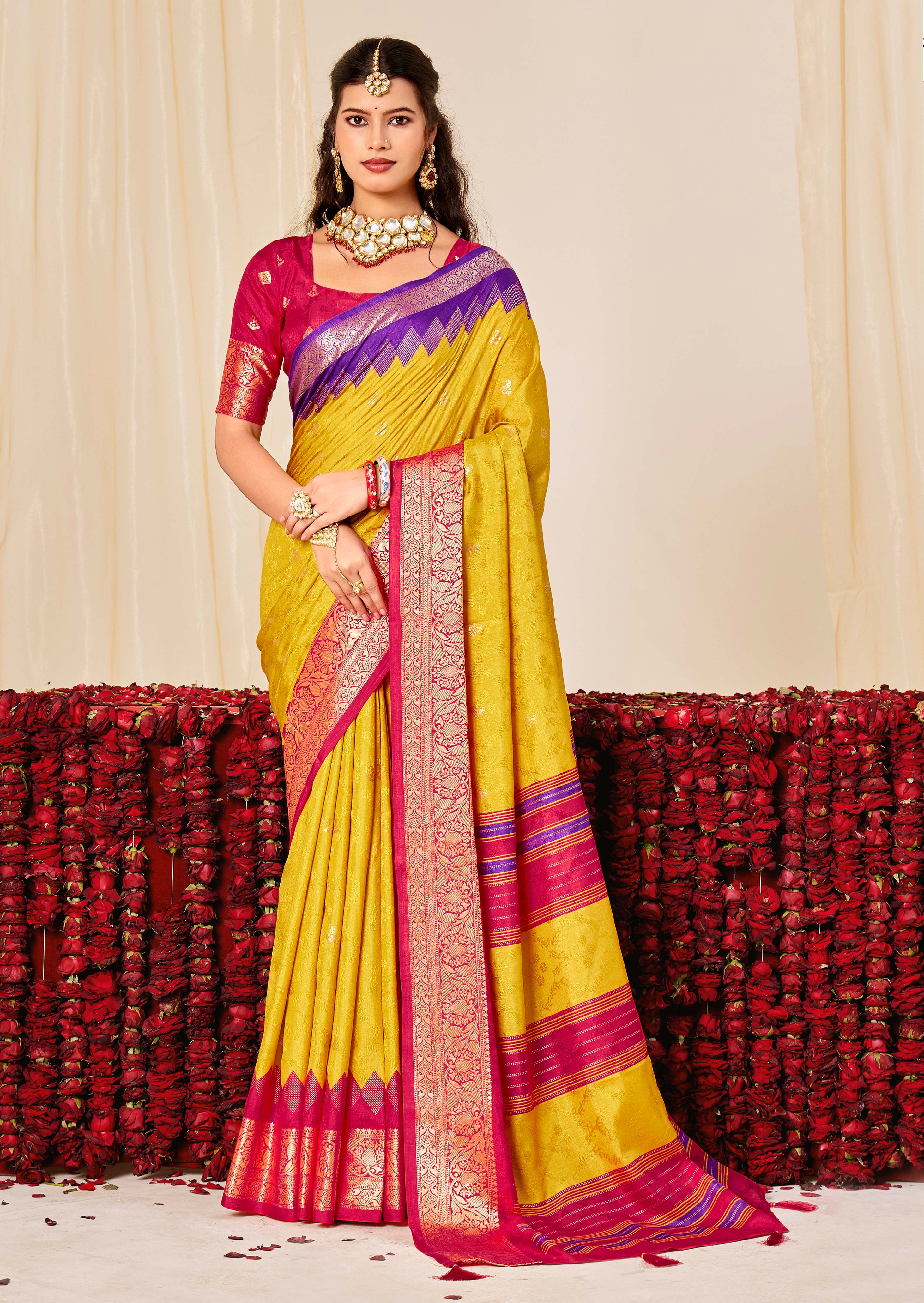 Yellow Color Velvet Tussar Silk Fabric Woven Saree With Smart Elegant Print