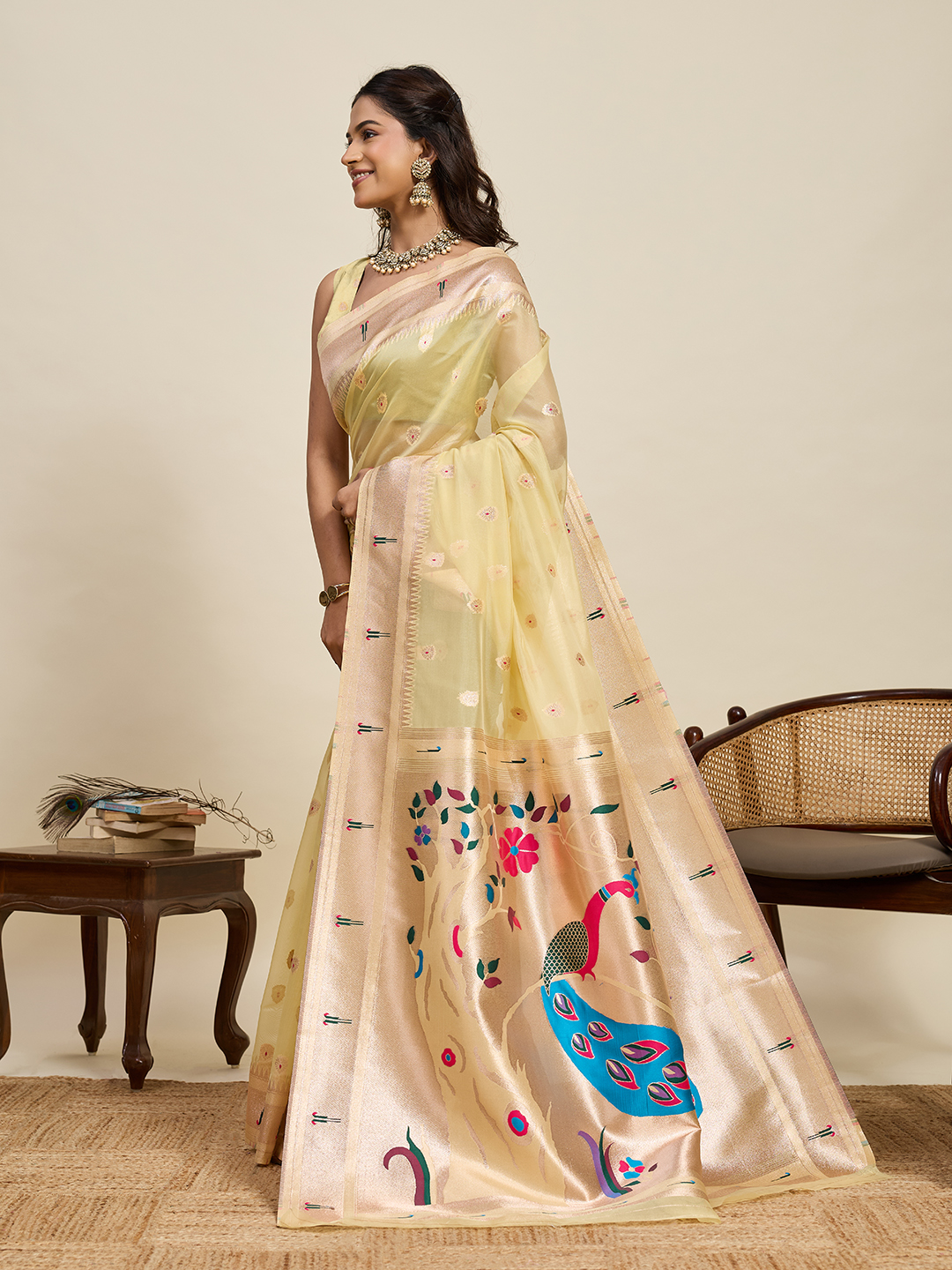 Garb This Party Wear Saree Paired With Blouse.This Saree And Blouse Are Cotton Silk Fabric With Woven Paithani Meenakari Designer. Buy This Pretty Saree Now.