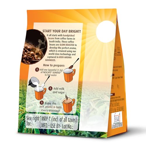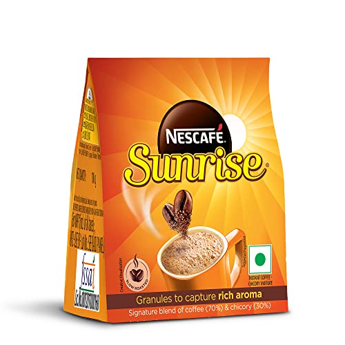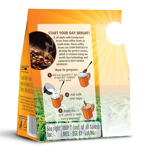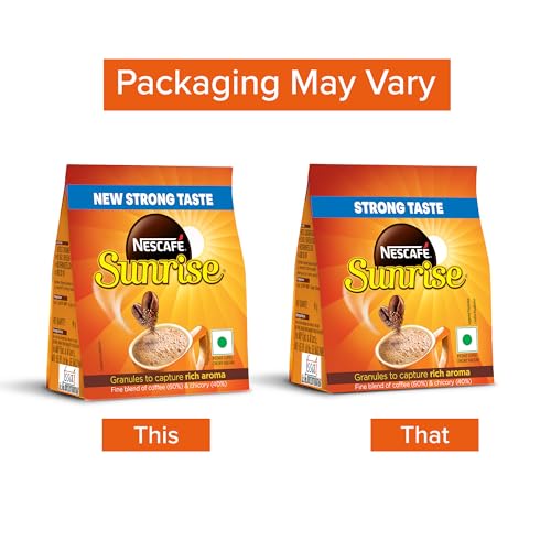 Start your day bright with the NEW STRONG TASTE of NESCAFE SUNRISE! It all begins with handpicked beans from the coffee farms of South India. These coffee beans are SLOW ROASTED to develop the perfect aroma which is retained using our world class expertise and captured in RICH AROMA GRANULES.