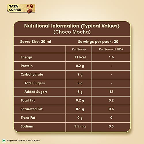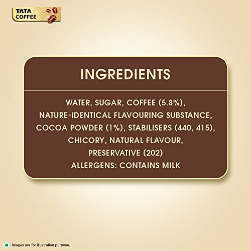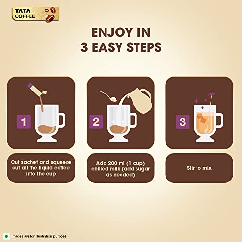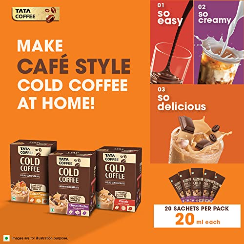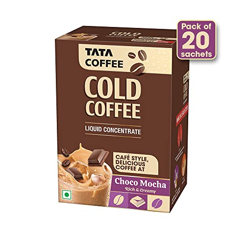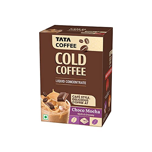 Tata Coffee brings to you a firstofitskind Cold Coffee Liquid Concentrate Range specially designed to make cafe-style delicious cold coffee that is so rich & creamy yet easy to make! Now you can enjoy a cafe-style coffee experience with Tata Cold Coffee Choco Mocha. It's everything you love about cold coffee. Explore the irresistible range of flavors Classic & Salted Caramel. USAGE INSTRUCTIONS: Make it in 3 easy steps. Cut sachet and squeeze out all the liquid into the cup. Add 200ml (1 cup) chilled milk (add sugar as needed). Stir to mix. STORAGE INSTRUCTIONS: No Shaker/Blender is required. Don't consume if the packet is puffed/leaky. Once opened consume fully.