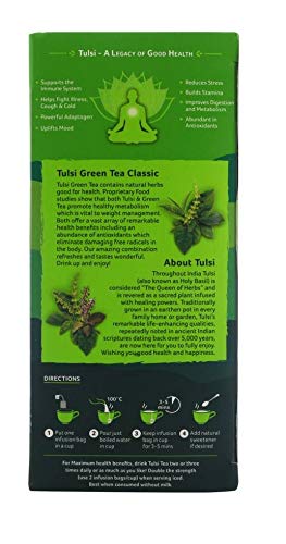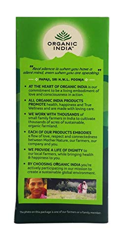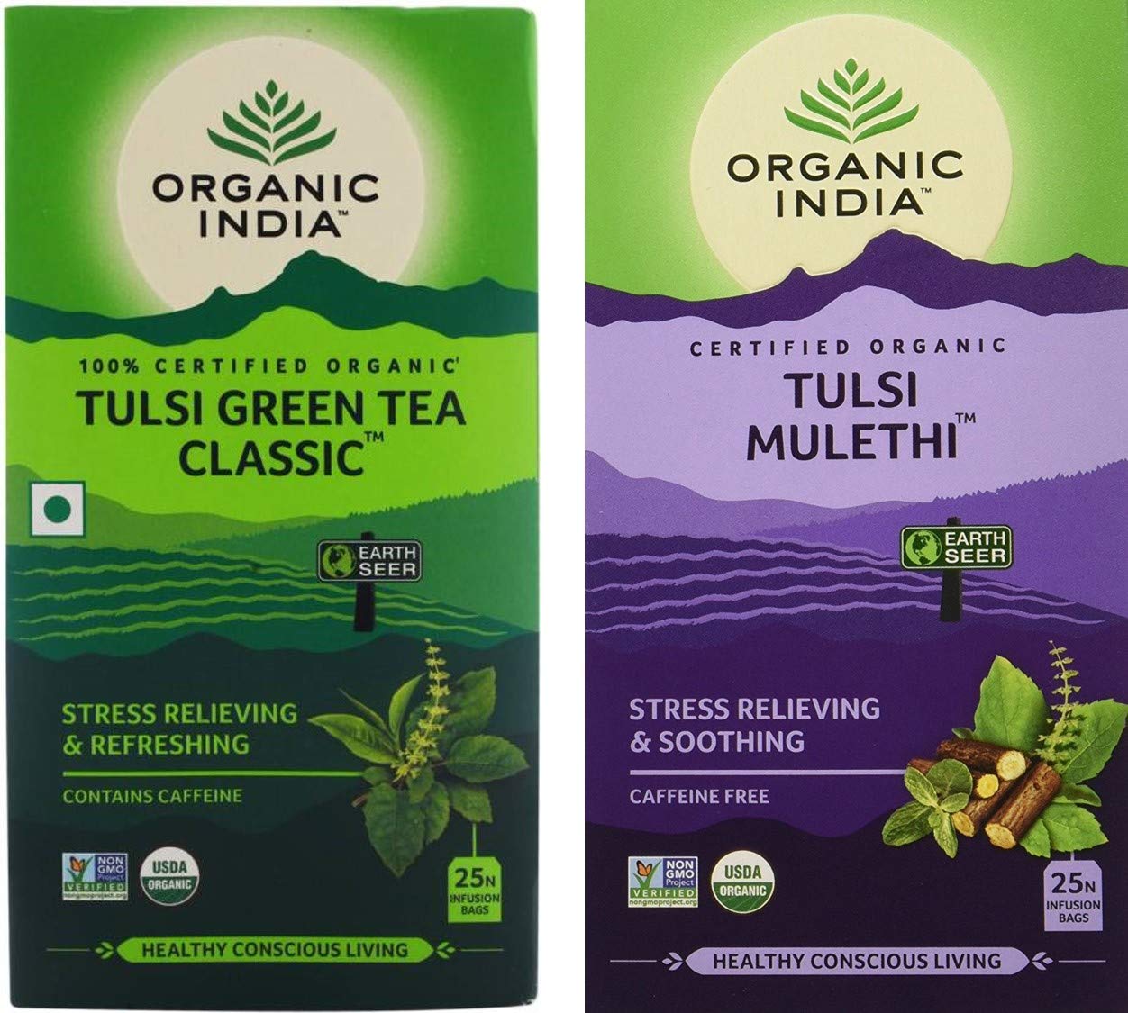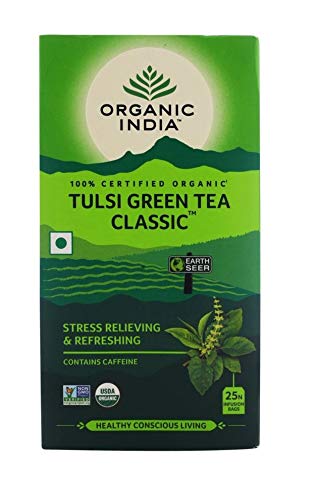 Tulsi Green Tea Classic 25 Tea Bag - Stress Relieving & Refreshing ORGANIC INDIA Tulsi Green Tea contains natural herbs good for healthClinical studies show that both Tulsi & Green Tea promote healthy metabolism which is vital to weight managementBoth offer a vast array of remarkable health benefits including an abundance of antioxidants which eliminate damaging free radicals in the bodyOur amazing combination refreshes and tastes wonderfulDrink up and enjoy ORGANIC INDIA Tulsi Mulethi 25 Tea Bag - Stress Relieving & Soothing Tulsi Mulethi (मुलेठी Licorice Root) - Relax and enjoy a fragrant soothing cup of delicious Tulsi Mulethi Tulsi “The Elixir of Life” blended with sweet Mulethi & a touch of tasty Peppermint will make your teatime a pure pleasure you will look forward to again and again!